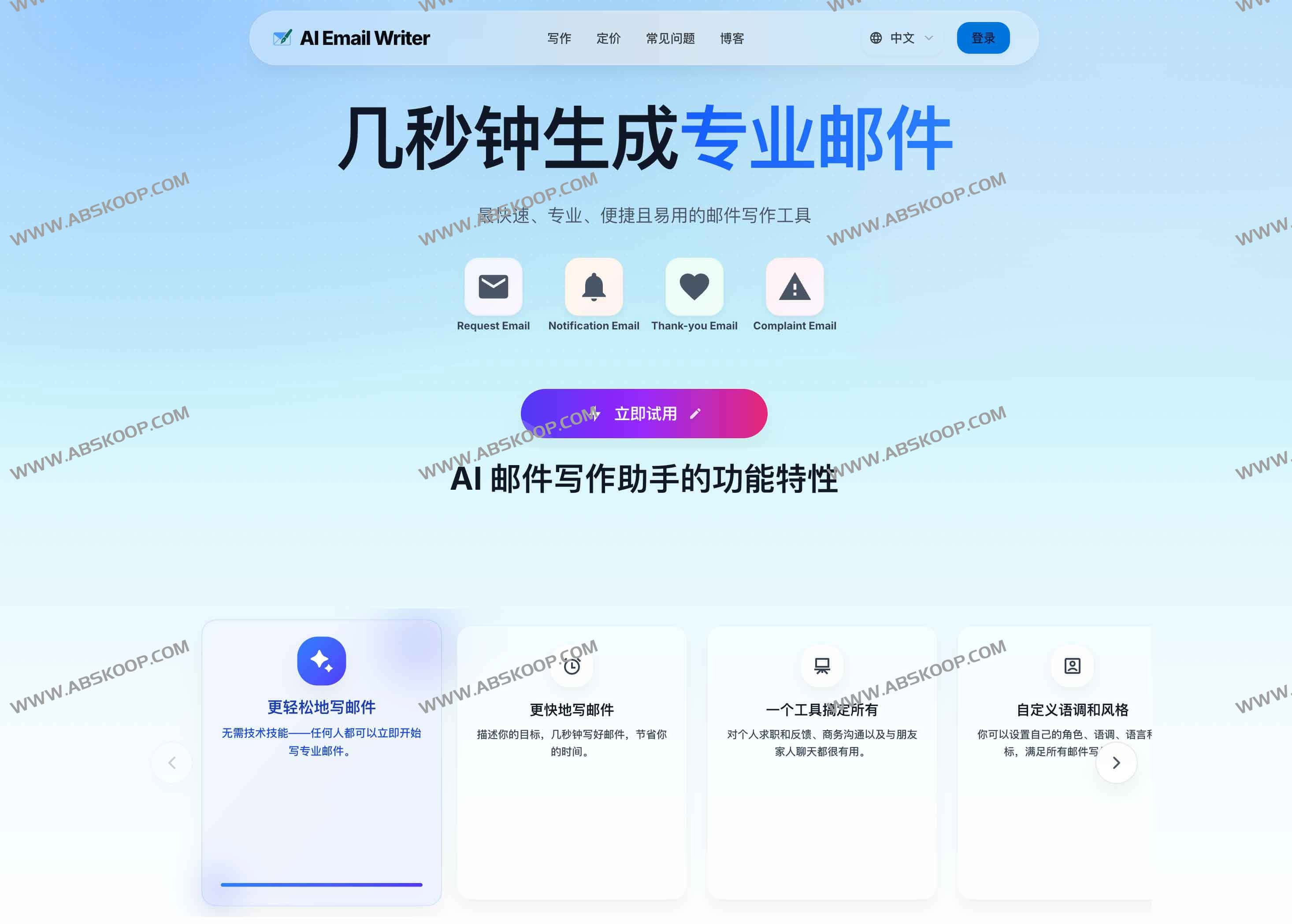 AI Email Writer(writemail.app)是一款专为忙碌职场人士和团队设计的人工智能邮件生成工具。用户只需输入简要需求,系统便能在数秒内产出语法准确、表达得体的高质量邮件,让沟通更高效、更专业。平台支持零配置上手,无需任何技术背景即可立即体验,每位新用户还可获得10次免费试用机会。