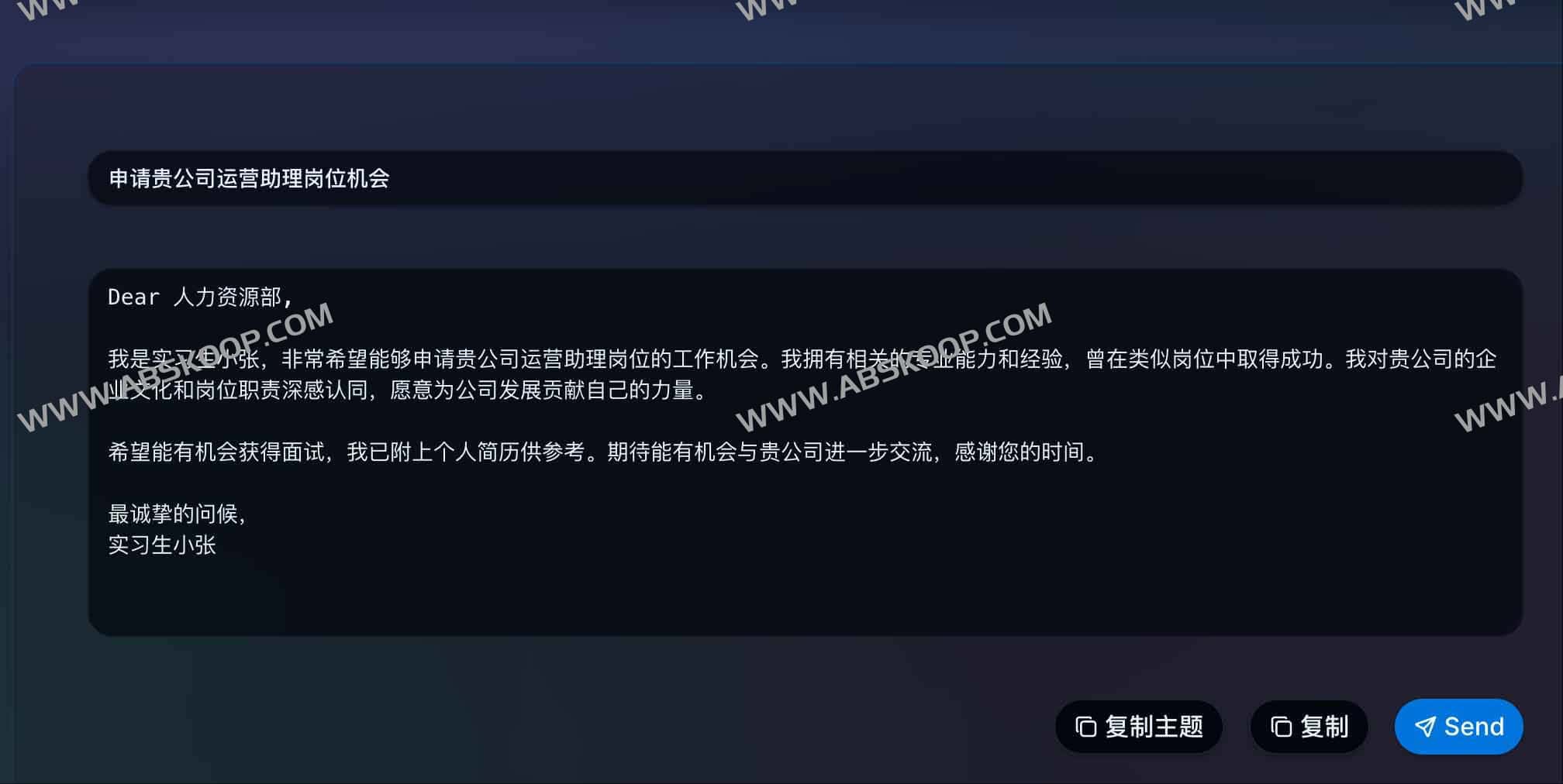 系统内置多种模板,适用于求职申请、客户跟进、销售推广、感谢函等场景。一套工具即可满足个人和企业全方位邮件需求。