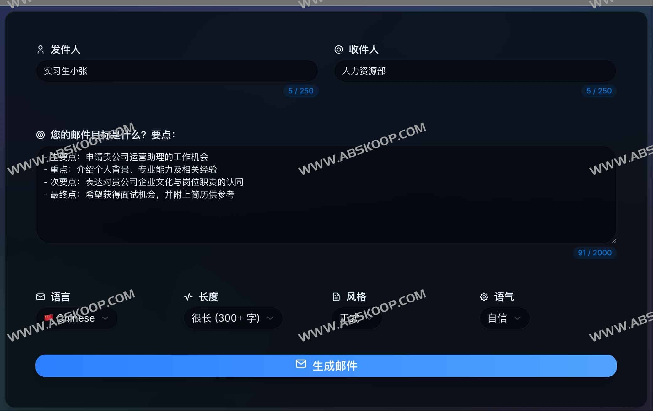 用户可自定义角色、语气、语言和写作目标,AI会根据设定自动调整邮件风格,确保内容与品牌或个人风格高度契合。