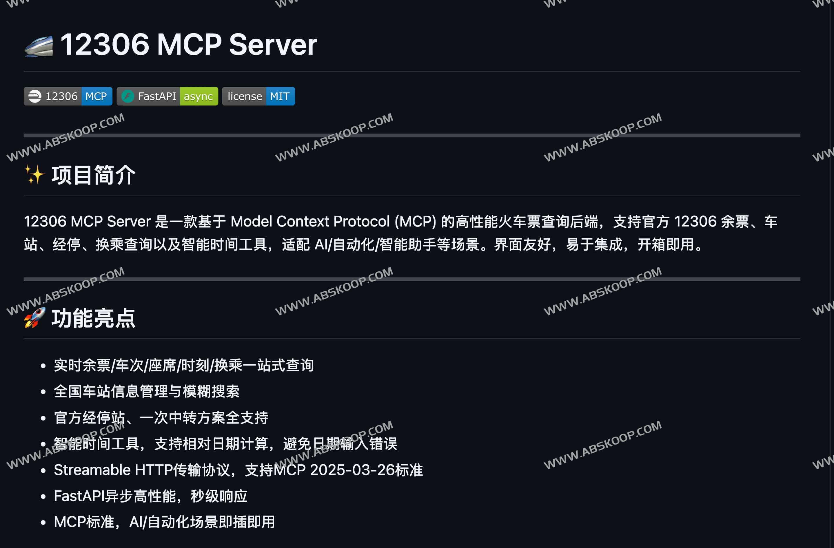 通过标准化 MCP 接口、高性能异步架构与即用型 Docker 镜像,12306 MCP Server 为开发者提供了快速、安全、易扩展的火车票查询解决方案,适配大模型、自动化脚本与企业系统等多元场景。