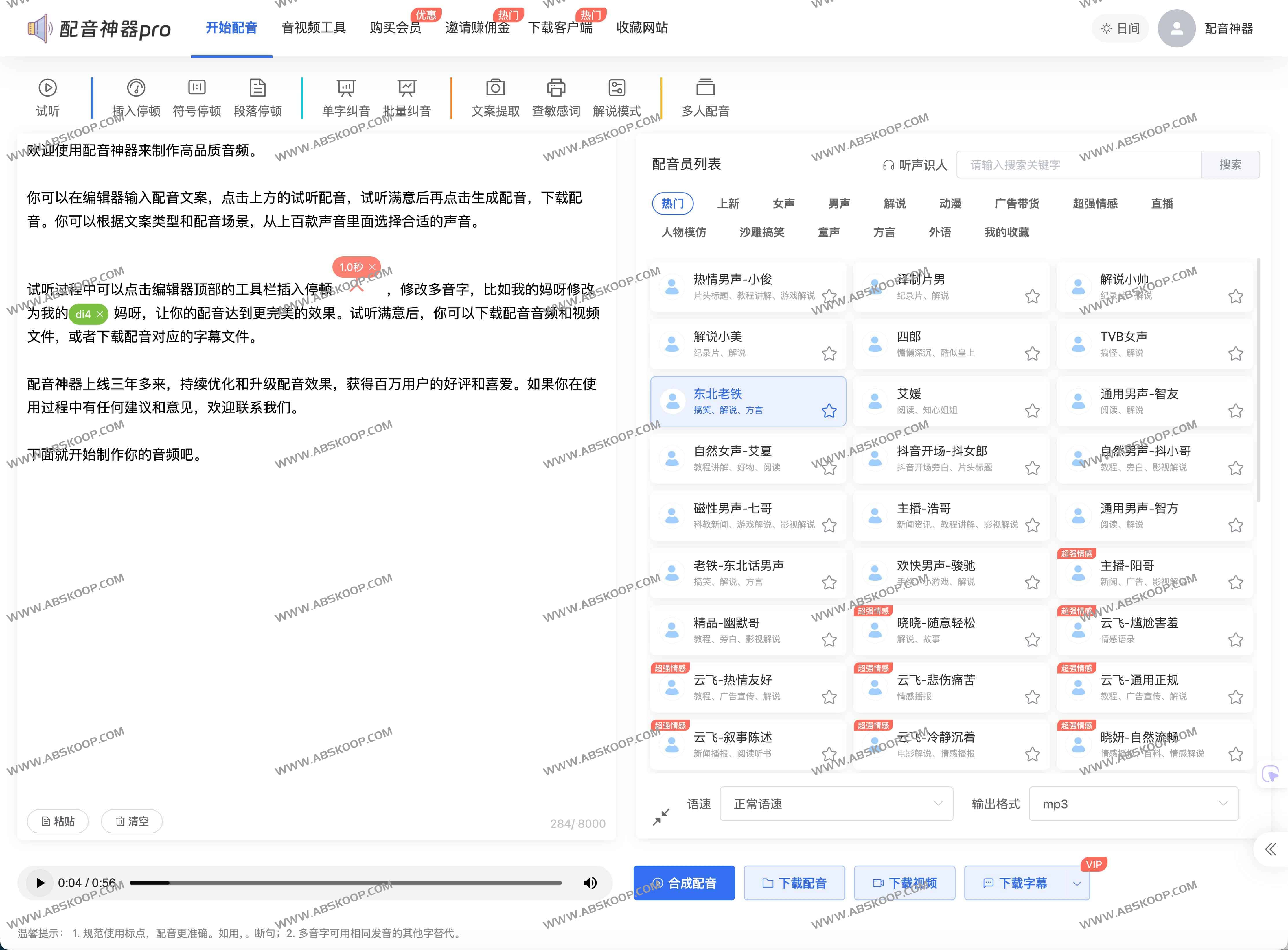 - 多人配音:同一项目中,不同段落可指定不同声音,一键合成