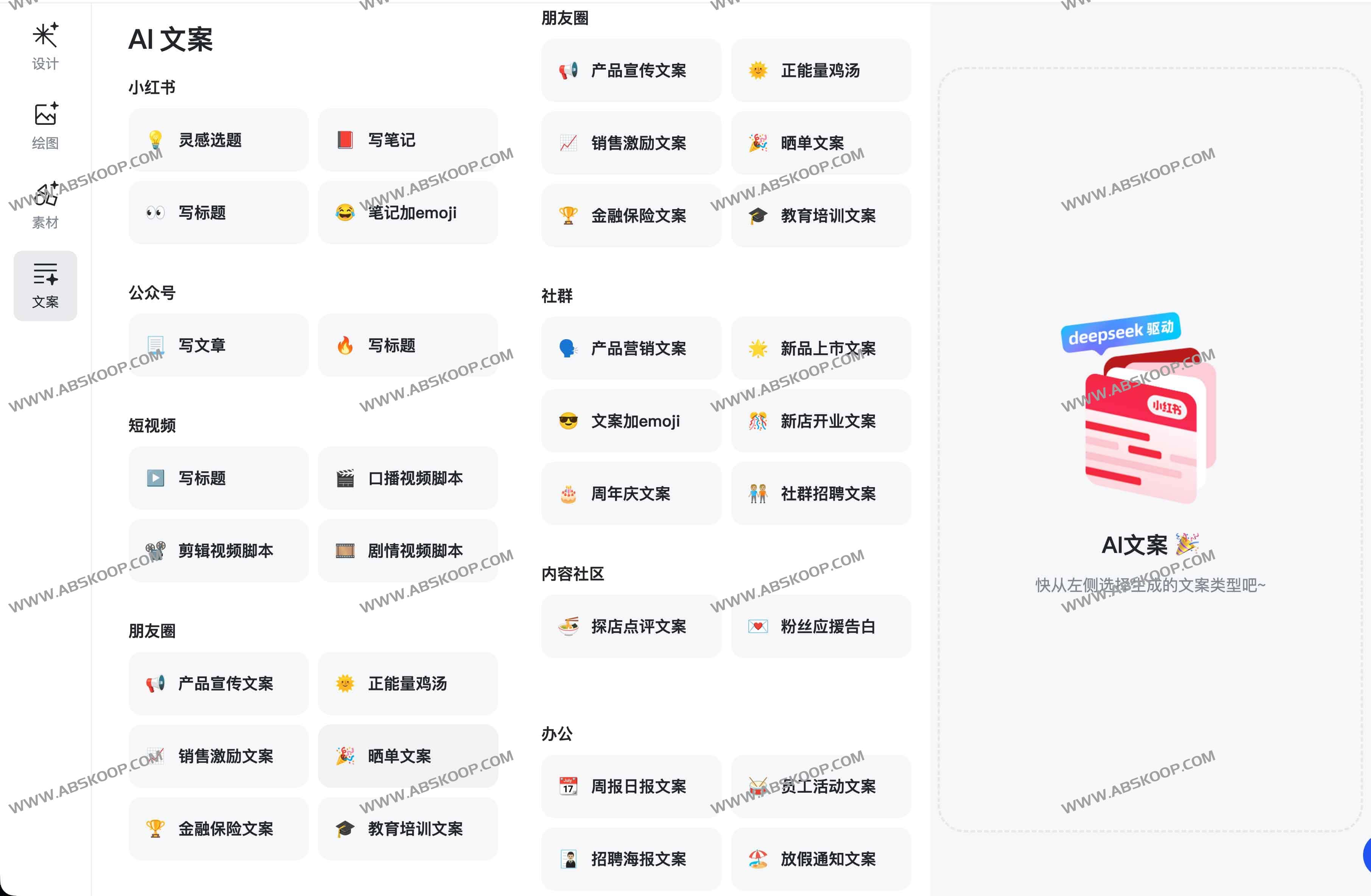 • 内置模板覆盖小红书、微信公众号、短视频脚本、朋友圈、招聘、员工活动等高频场景,满足日常运营和营销需求。