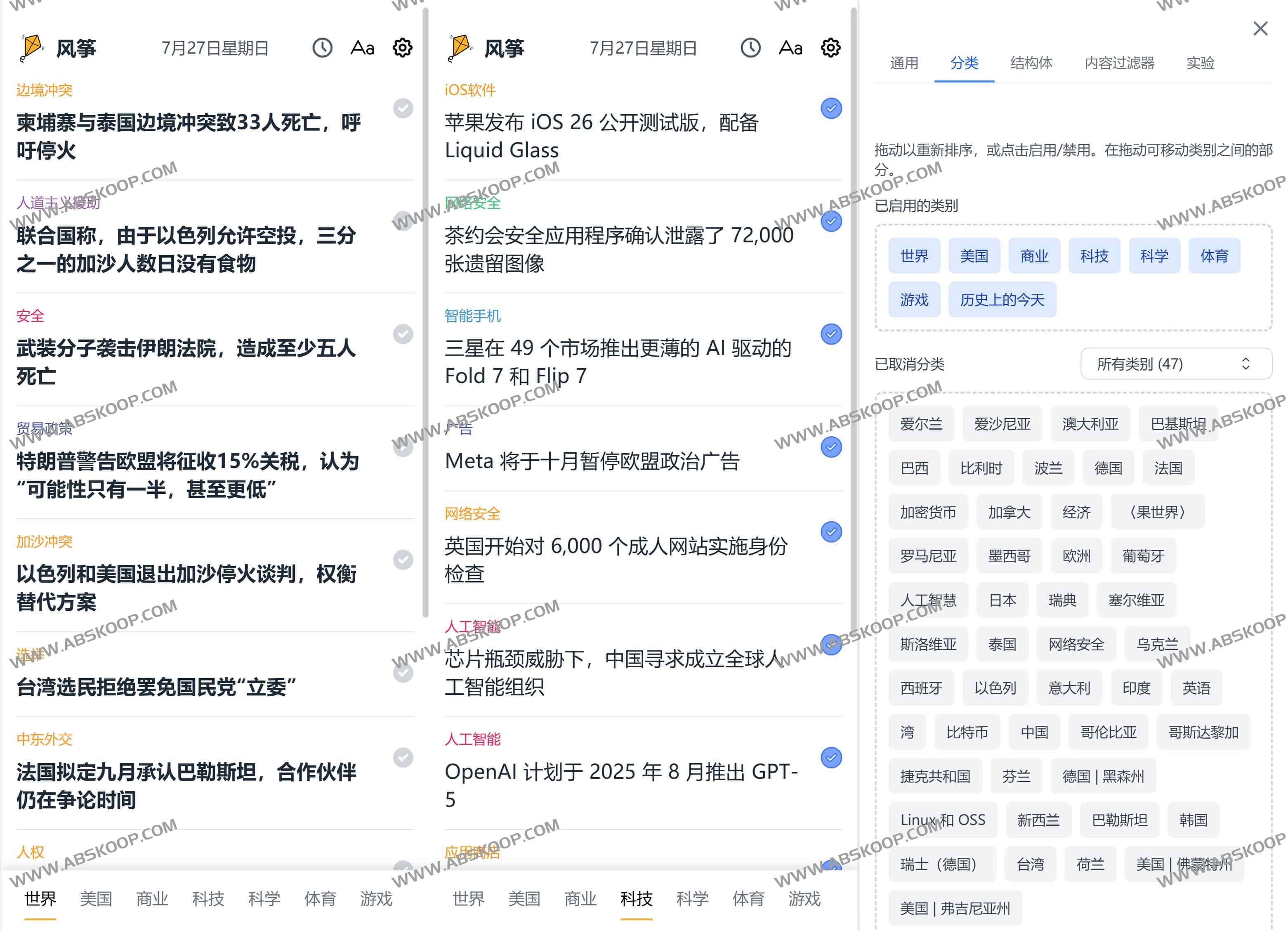 - 多源聚合:读取数千条全球公开 RSS 源,覆盖政治、科技、商业等领域。