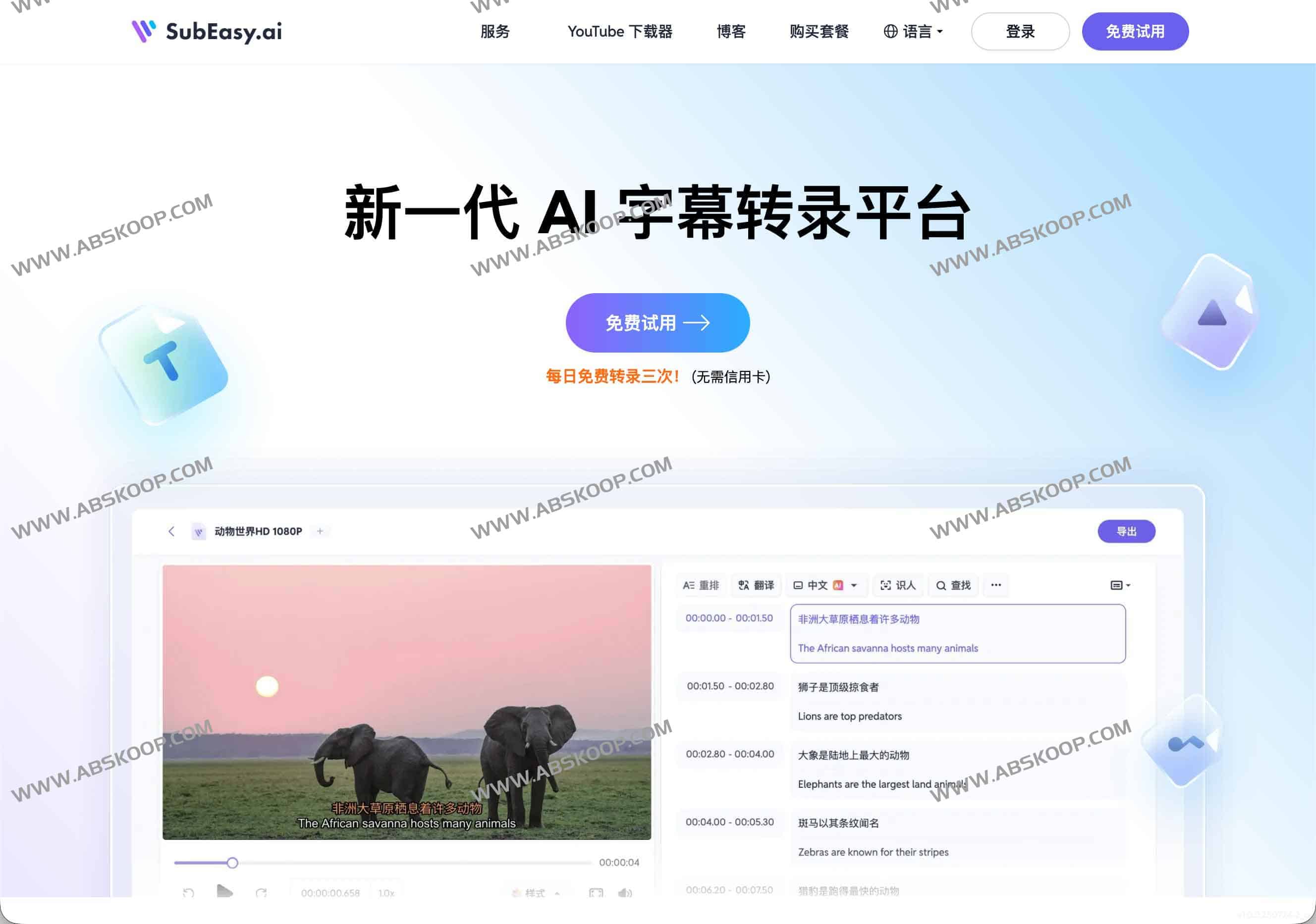 SubEasy 是一款面向内容创作者和企业的全能 AI 字幕与语音转录服务平台,依托 Whisper 技术实现高达 98.9% 的识别准确率,支持每日三次免费转录及无限制付费转录方案,兼容多种音视频格式并提供丰富的导出选项。SubEasy 内置在线编辑器与智能重排技术,能在短时间内完成精准分段、同步对时和多语言翻译,显著提升字幕制作效率和观感体验。