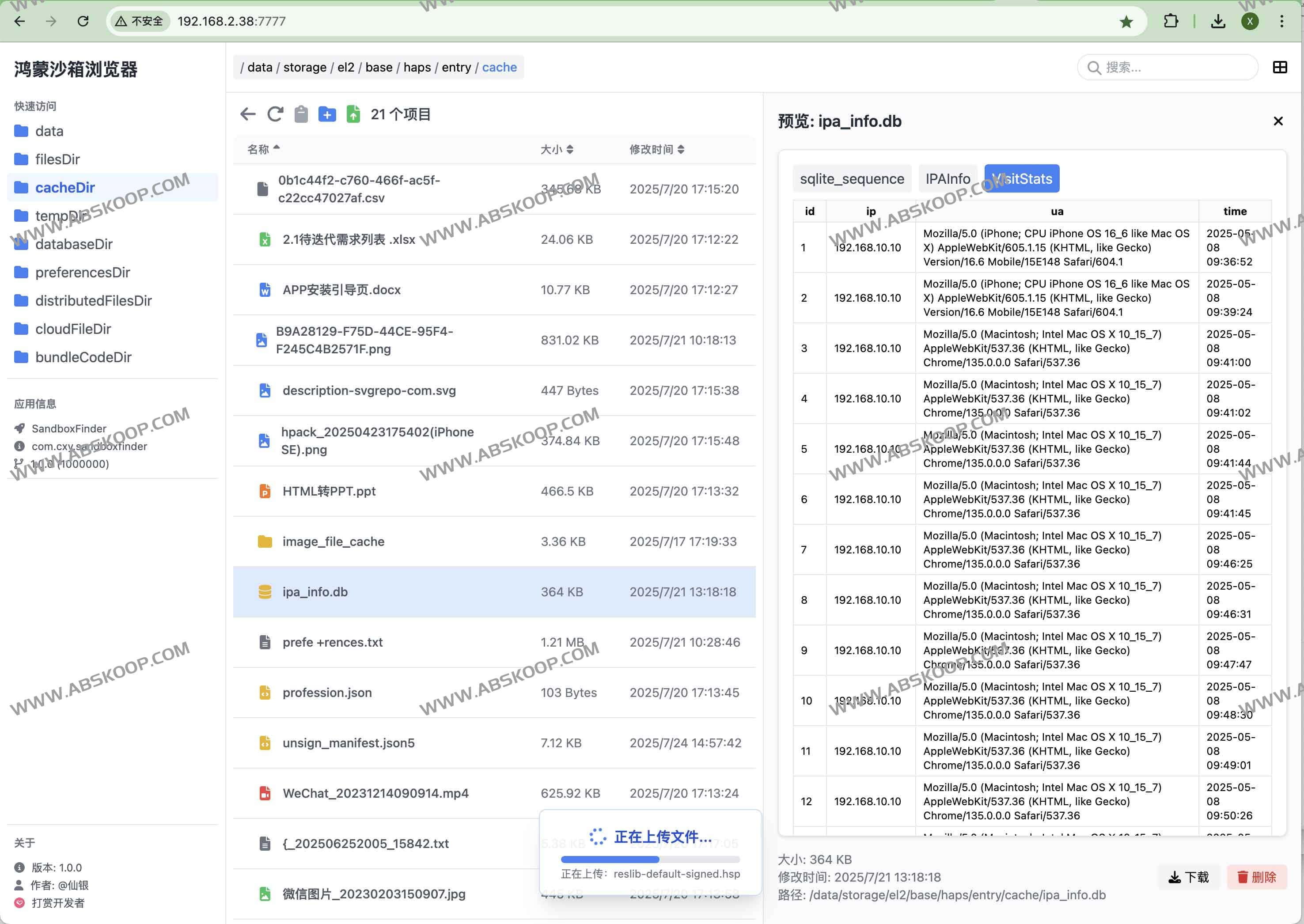 - 提供目录快捷入口(filesDir、cacheDir、tempDir、databaseDir 等),点击即跳转。