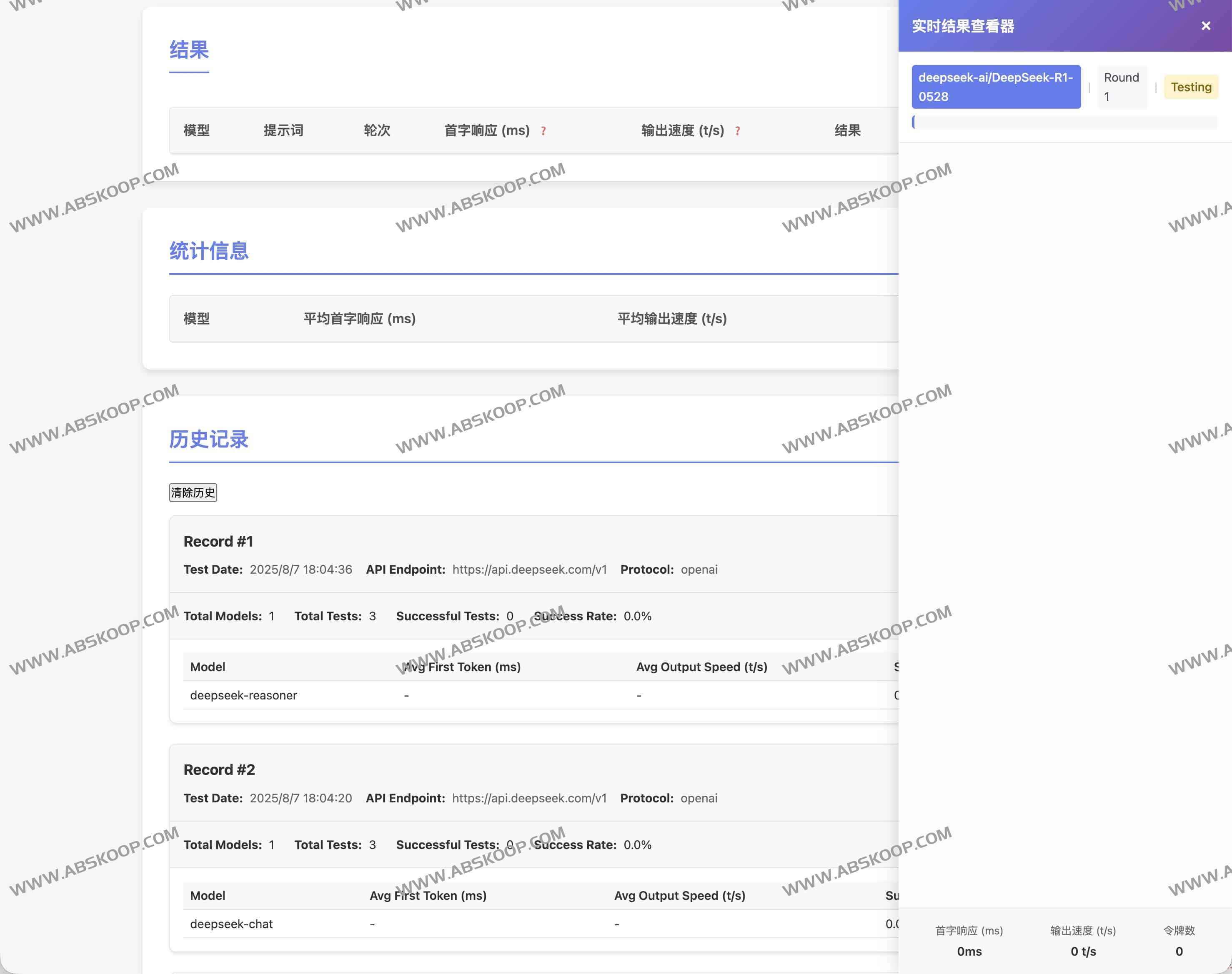 - 设置测试轮次、并发度与自定义提示词,点击 Start Test 即可实时查看指标。