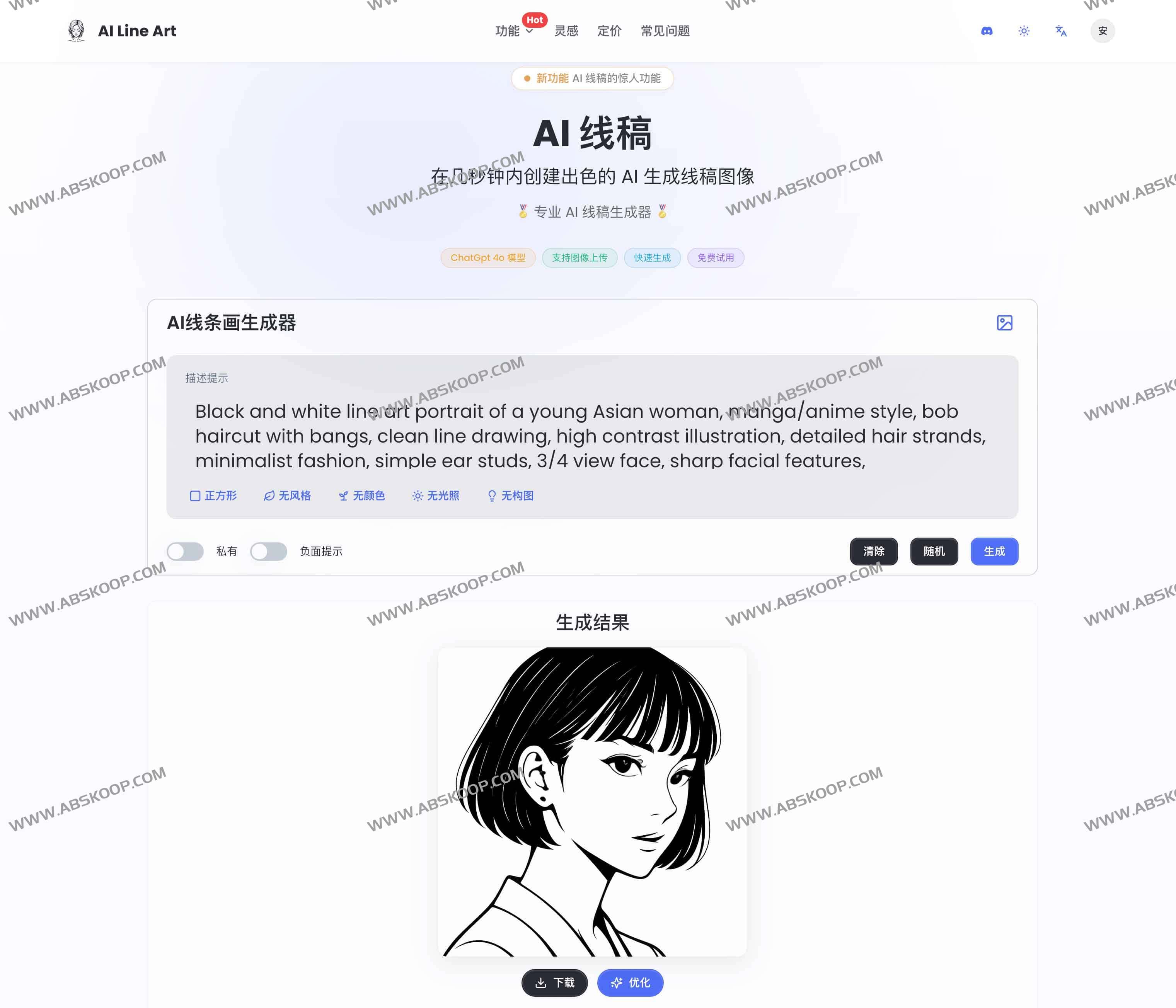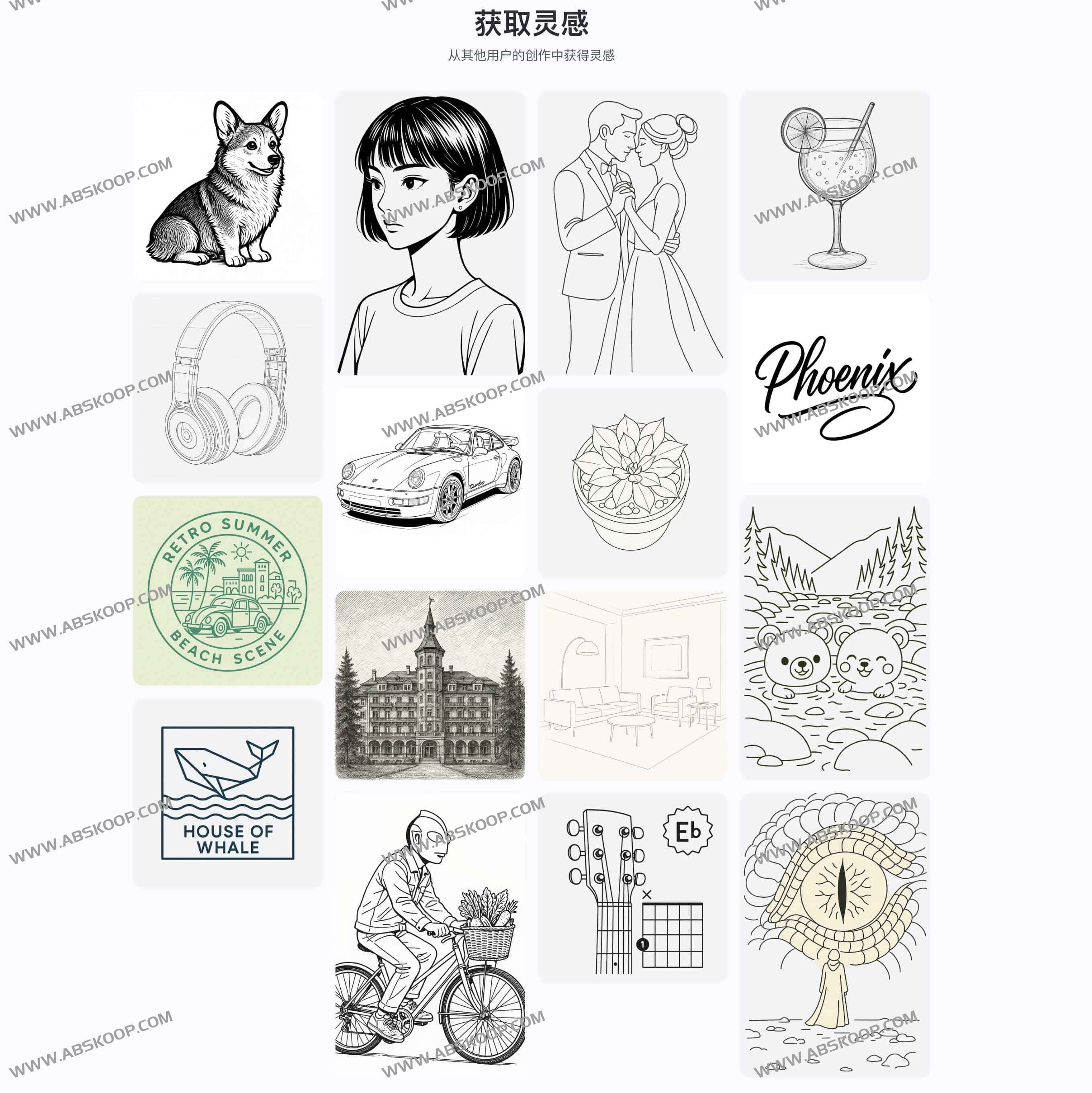- 多种艺术风格:素描、铅笔、木刻、水彩、极简、连续线条、漫画、建筑图、时装草图、矢量/像素/3D线条渲染等。