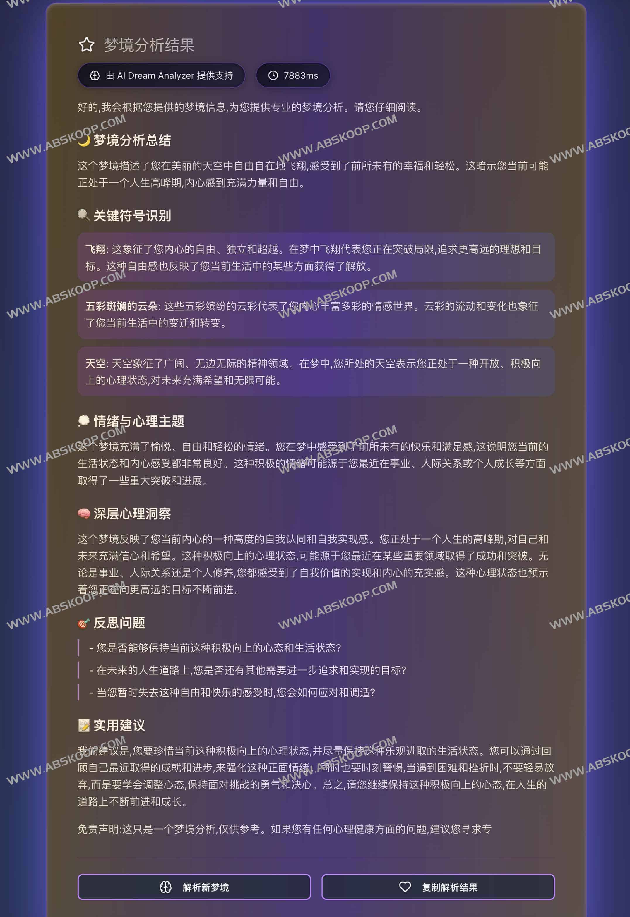 • AI 解梦插件:输入你的梦境描述,AI 将即时分析其中的象征、情绪和潜在含义