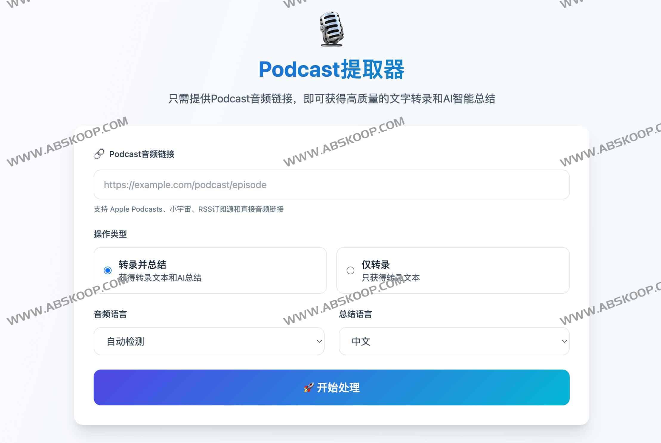 AI播客提取器(AI Podcast Transcriber)是一个开源的全栈Web应用,专为播客音频转录与智能总结设计。它能自动解析来自Apple Podcasts、小宇宙、RSS订阅源以及直接音频URL的内容,并将音频快速转化为高质量的文字稿,同时生成结构化的AI总结。