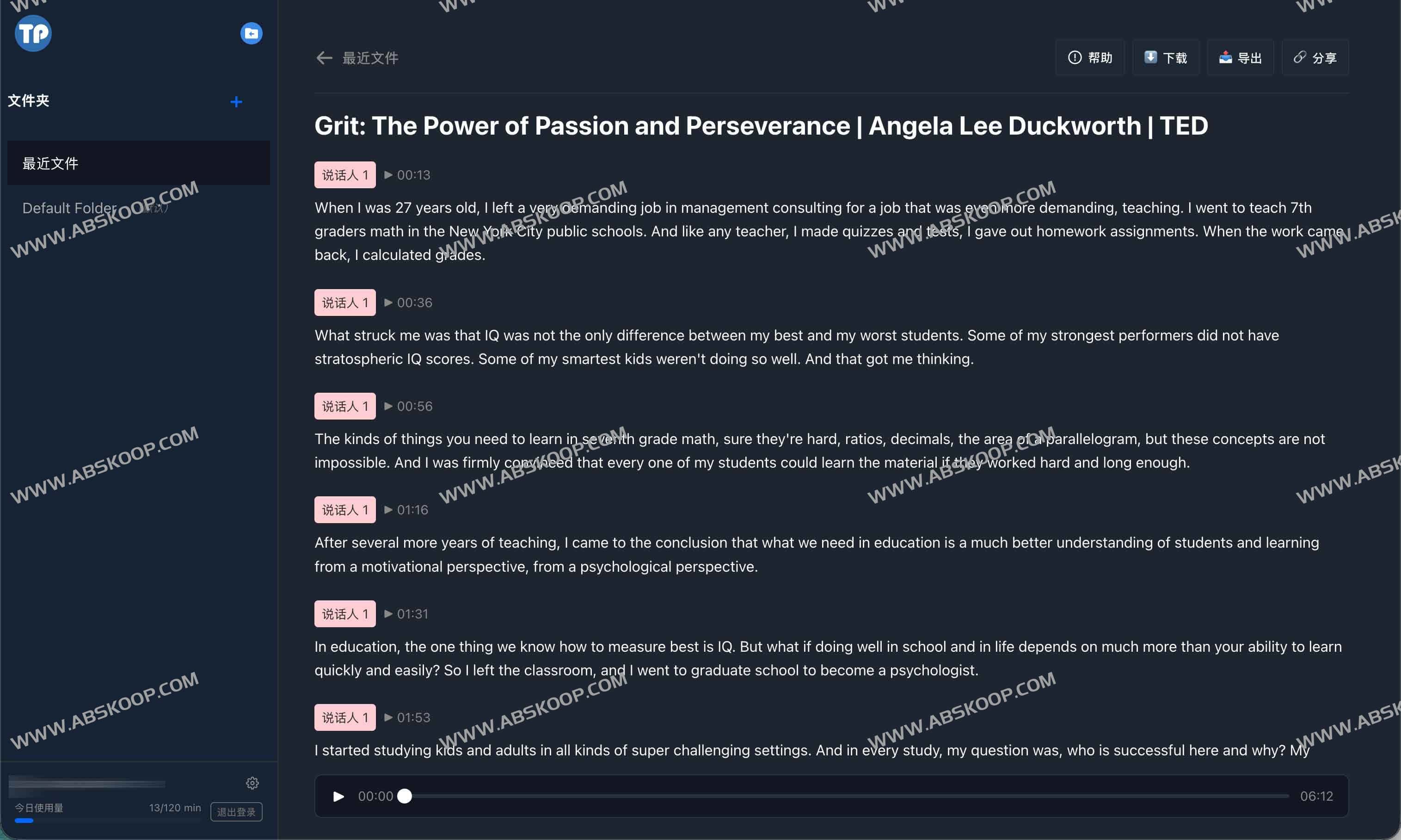 TransPocket 是一款基于 Whisper 模型的免费音频与视频转文字工具。用户可以快速将音频、视频文件及 YouTube 视频转录为精准的文本,支持 100 多种语言,并具备说话人识别功能。平台永久免费,无需订阅或隐藏收费,每天可免费使用 120 分钟。