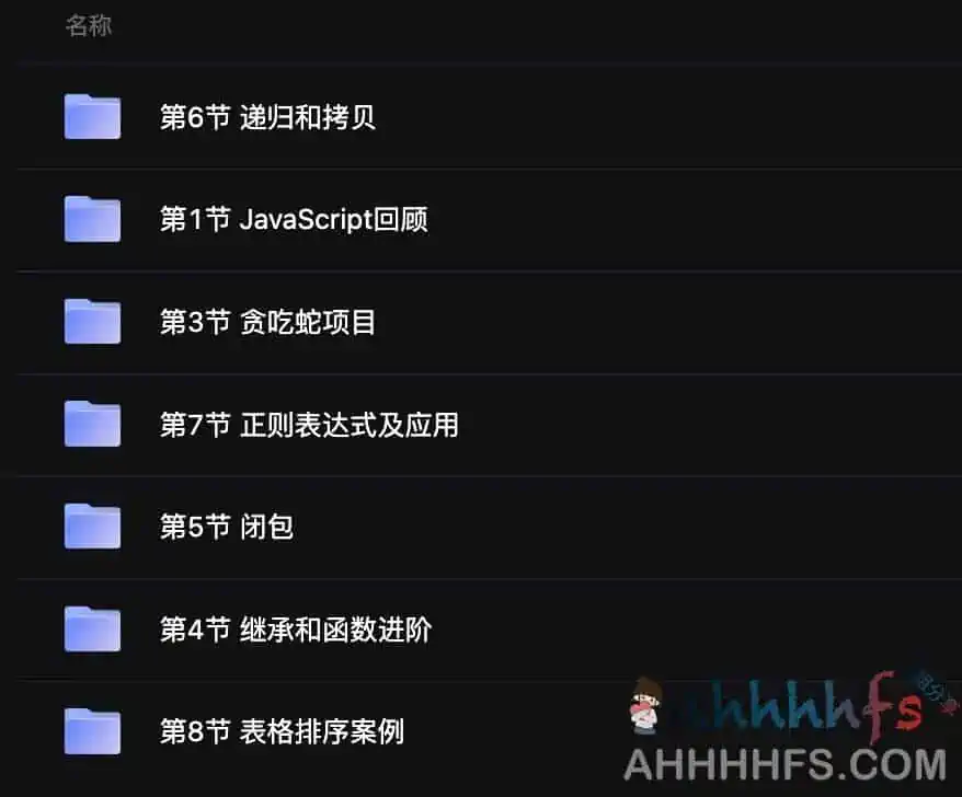 JavaScript 高级开发课程由包括面向对象介绍及应用 , 继承和函数进阶,闭包 、 递归和拷贝 ,正则表达式及应用 , 表格 排序 案例 等 高级 课程 组成 , 还有贪吃蛇项目以供同学们进行参考学习 。