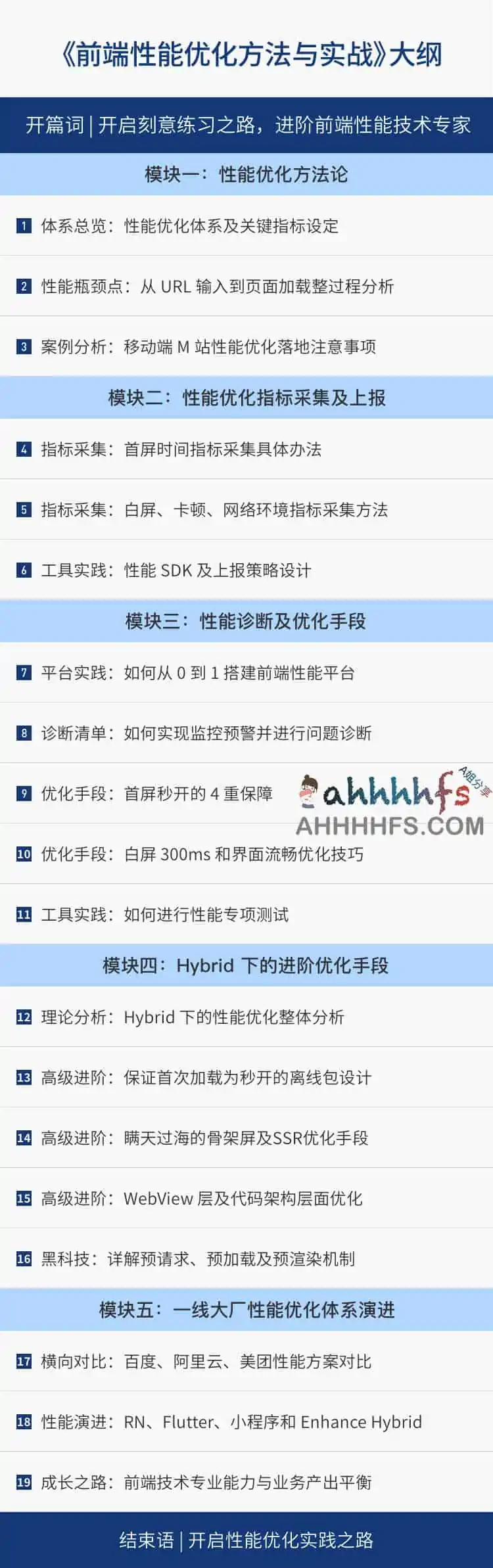 模块五 一线大厂性能优化体系演进:这个模块讲师会介绍,一线大厂的性能解决方案和演进过程,比如,腾讯的首屏方案和美团的首屏方案各有哪些优缺点,分别适合哪些场景;使用多端方案场景的业务,我们该如何优化性能等等。 通过这个模块的学习,你会了解一线大厂性能优化方案。