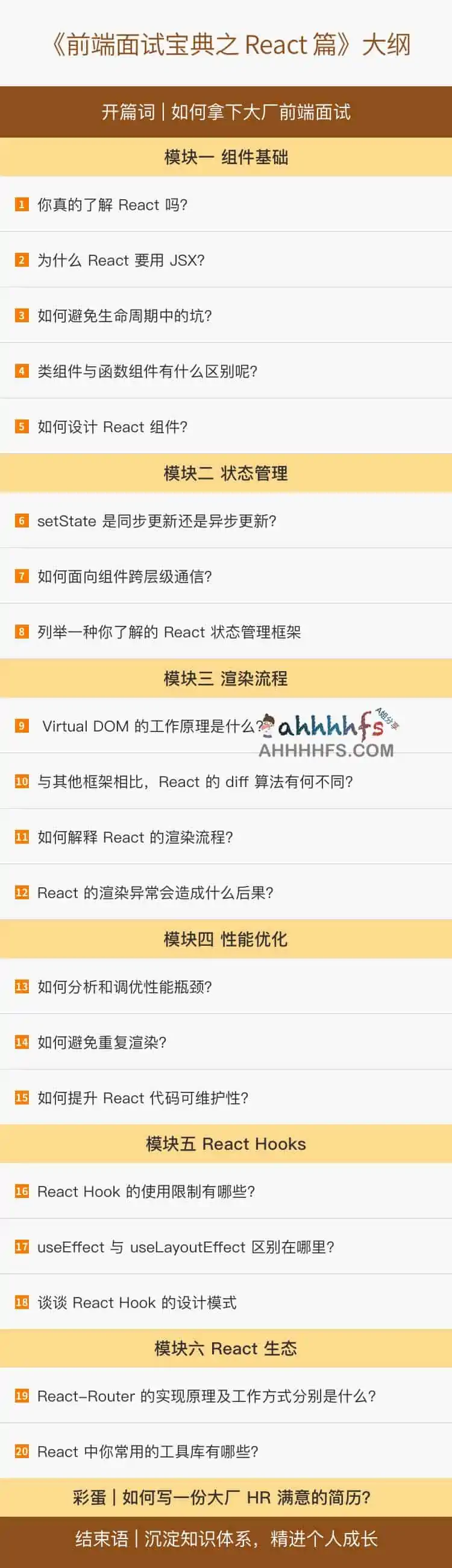专栏按照React 核心考点分为 6 大模块,20 讲,以大厂面试真题为核心,通过“分析题干”->“构建知识导图”->“横向技术对比与纵向原理解析”->“解题思路”的流程逐步梳理 React 学习要点。