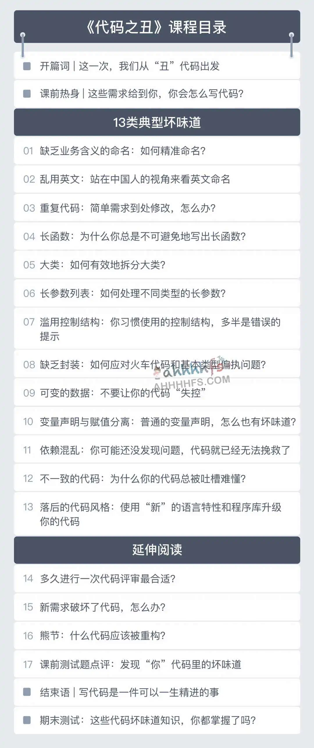 1. 13 类典型的坏味道。在这个模块中,我会直接用我们工作中的真实代码作为案例,带你发现潜藏在你的编程中的那些坏味道。同时,帮你深入剖析这些坏味道产生的原因,以及解决这些坏味道的常见重构手法。