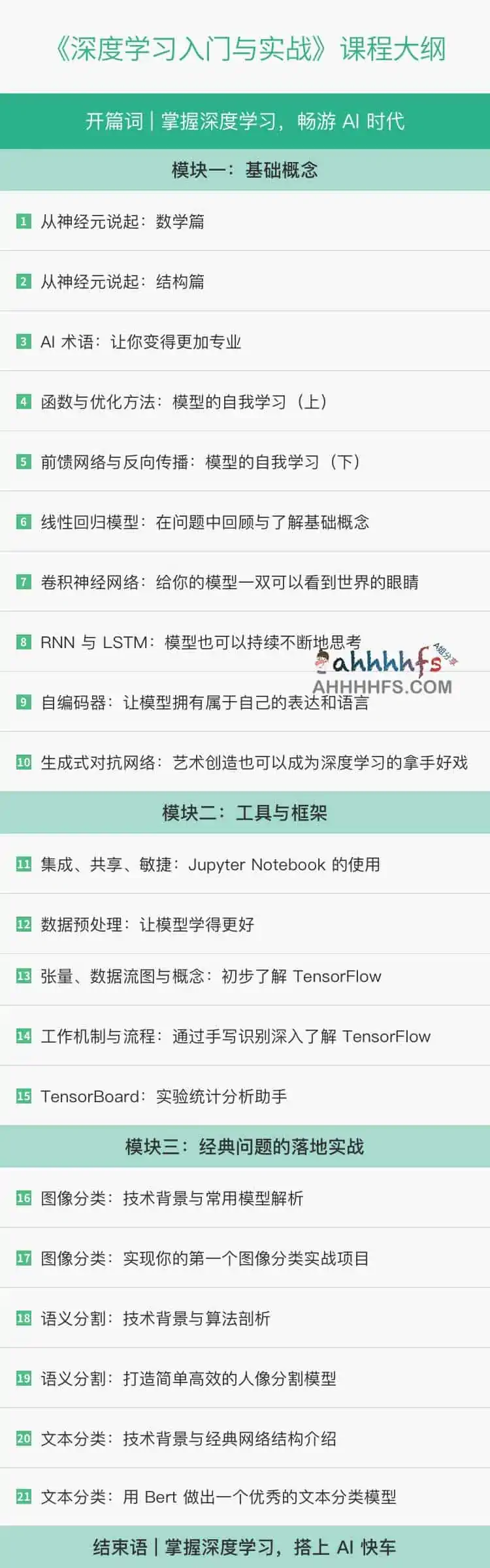 模块三:深度学习经典问题的落地实战。这个模块就开始教你盖楼了,老师会选择几个常见的深度学习应用场景,包括图像分类、语义分割和自然语言处理,教你如何从零开始做模型、如何优化已有模型,一步步教你打造项目模型。通过这一部分的学习,你就可以打造属于你自己的深度学习模型。