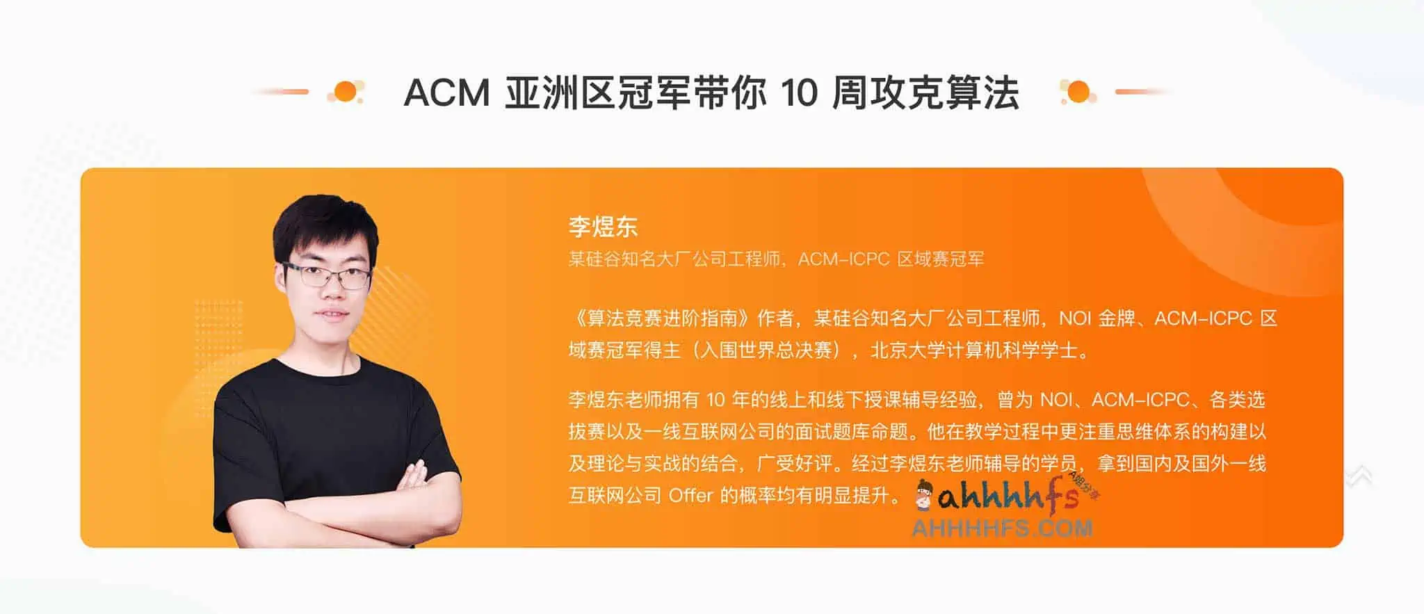 李煜东老师拥有 10 年的线上和线下授课辅导经验,曾为 NOI、ACM-ICPC、各类选拔赛以及一线互联网公司的面试题库命题。他在教学过程中更注重思维体系的构建以及理论与实战的结合,广受好评。经过李煜东老师辅导的学员,拿到国内及国外一线互联网公司 Offer 的概率均有明显提升。