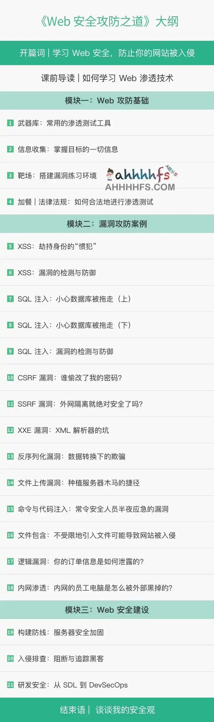 模块二:漏洞攻防案例。作为这门课最硬核的部分,在模块一的基础上,补充了一些实用的工具和测试方法(例如sqlmap 的使用),讲解了各种常见的 Web 漏洞攻防原理,教你如何进行安全测试,并搭建靶场进行演练。通过这一部分的学习,你可以掌握 XSS、SQL 注入、CSRF 等常见 Web 漏洞类型的攻击与防御方法。