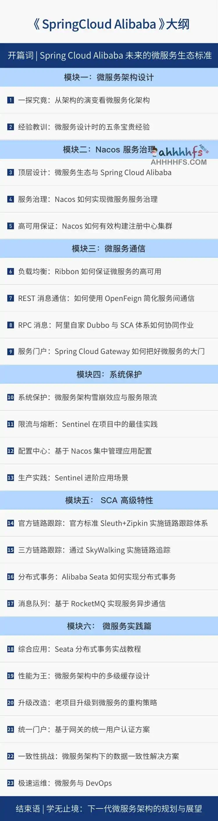 微服务架构本质是一种架构的实现方案,它在原有的基础上对分布式架构作出进一步扩展与标准化。专栏将利用大量的实际案例、图形、表格为你全方面勾勒出 Spring Cloud Alibaba 轮廓,并按照构建微服务的过程讲解,从基础搭建到上层应用共分为六个模块:
