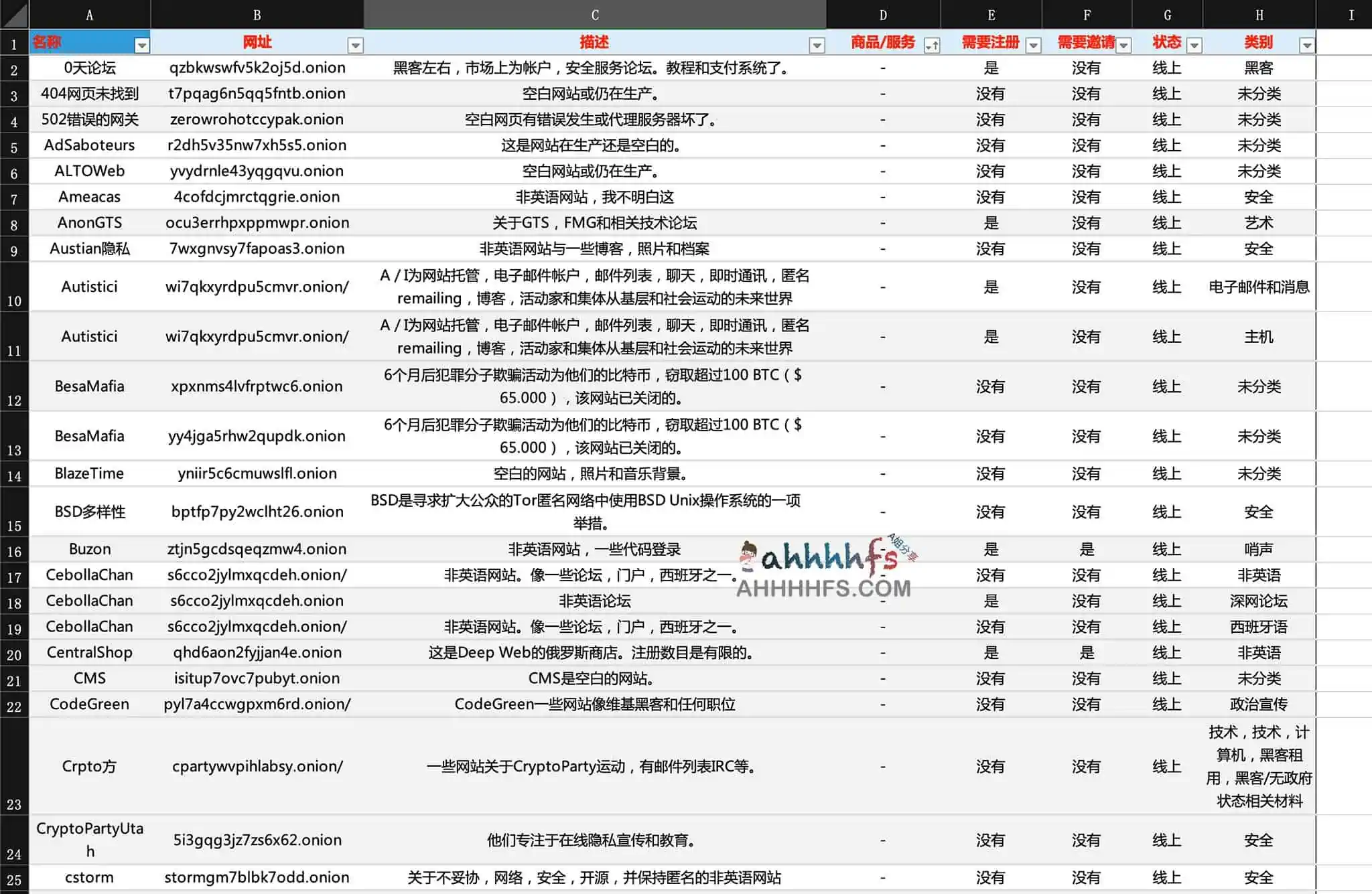 一些暗网网址集合 2000+个,来源于网络,整理成了一个xlsx文档了,有名称、描述和类别等等信息,暗网地址是以.onion结尾的,使用普通浏览器是无法打开的,需要配合 Tor 浏览器才可以使用,有需要的可以下载研究一下,其他的自行测试哈,大家注意安全哈。