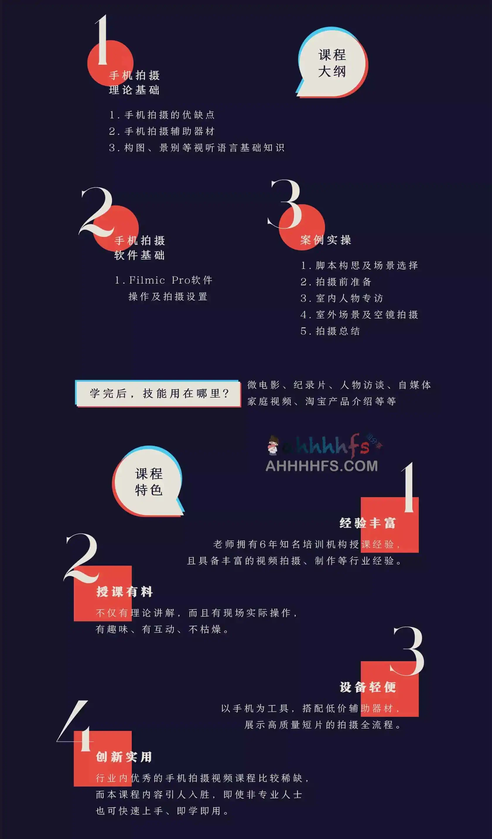 内容包括手机拍摄短片的全流程,如何借助简单辅助器材弥补,手机拍摄在稳定性、灯光、声音及运动镜头方面的问题,视频拍摄软件Filmic Pro的使用,拍摄思路的搭建和现场拍摄的过程。