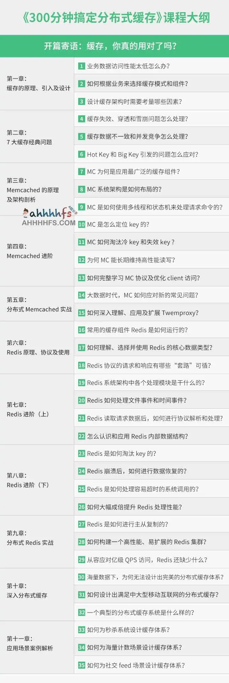 内容会以 3 个实际应用场景为例,深度分析缓存在秒杀系统、计数器、Feed 流中的应用,可以帮助你收获不同场景下、不同设计策略的启发,给你一套完整的缓存系列能力进阶图谱。