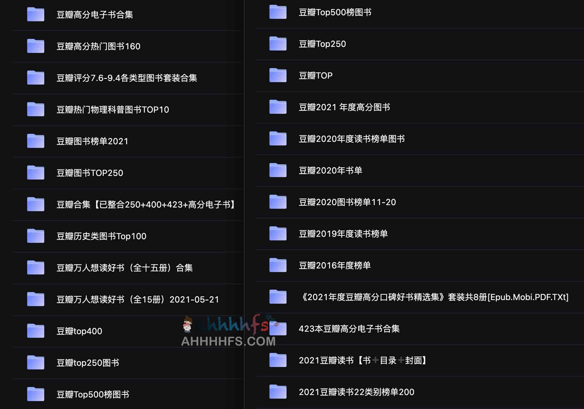 一些豆瓣读书系列电子书集合,包括豆瓣高分电子书、豆瓣TOP、豆瓣读书榜单等等,按照文件夹打包,非常丰富,阿里云盘资源。