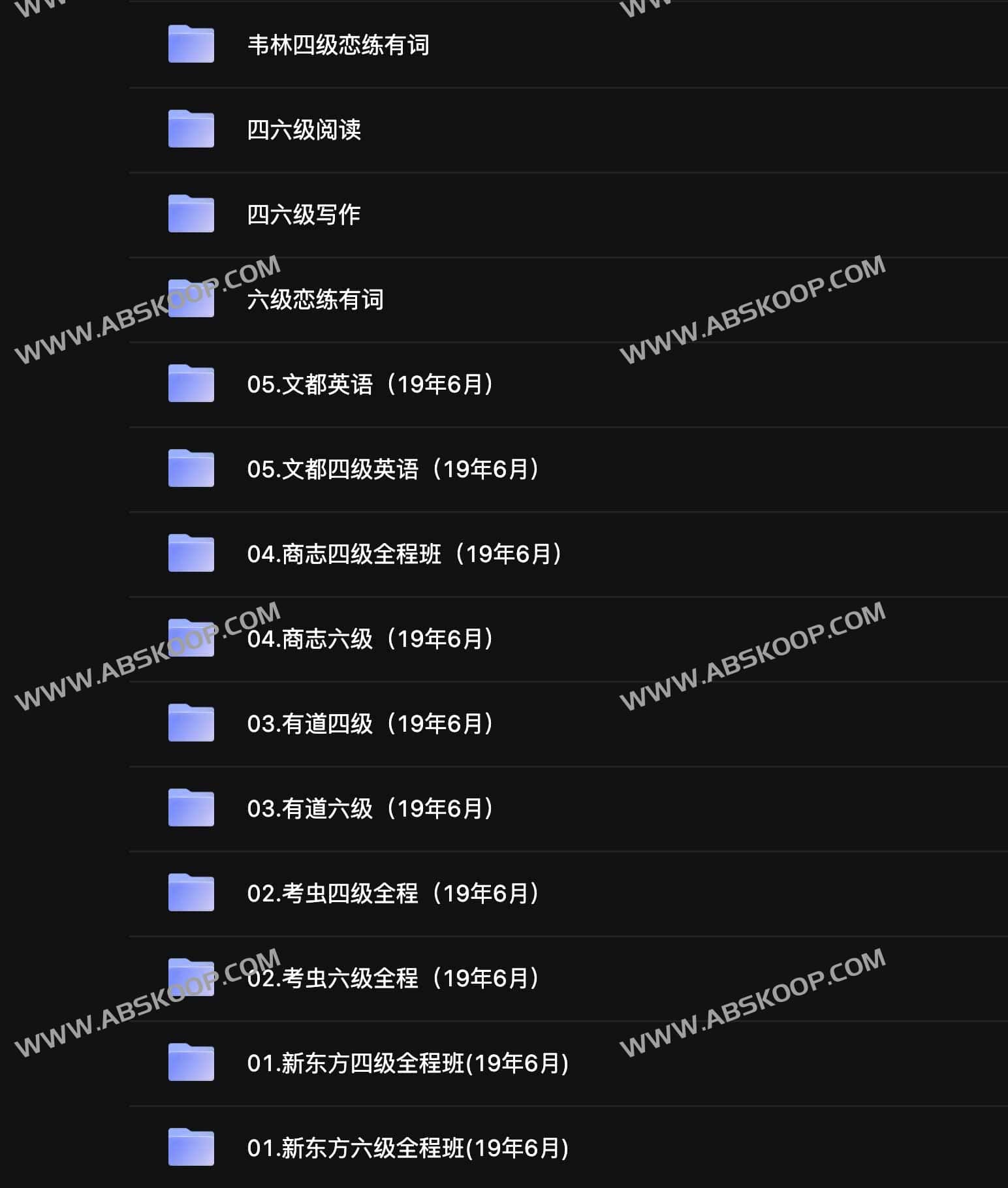 大学英语四六级课程集合,包括新东方六级全程班、有道六级、商志四级全程班、考虫四六级全程等等课程,阿里云盘资源下载。