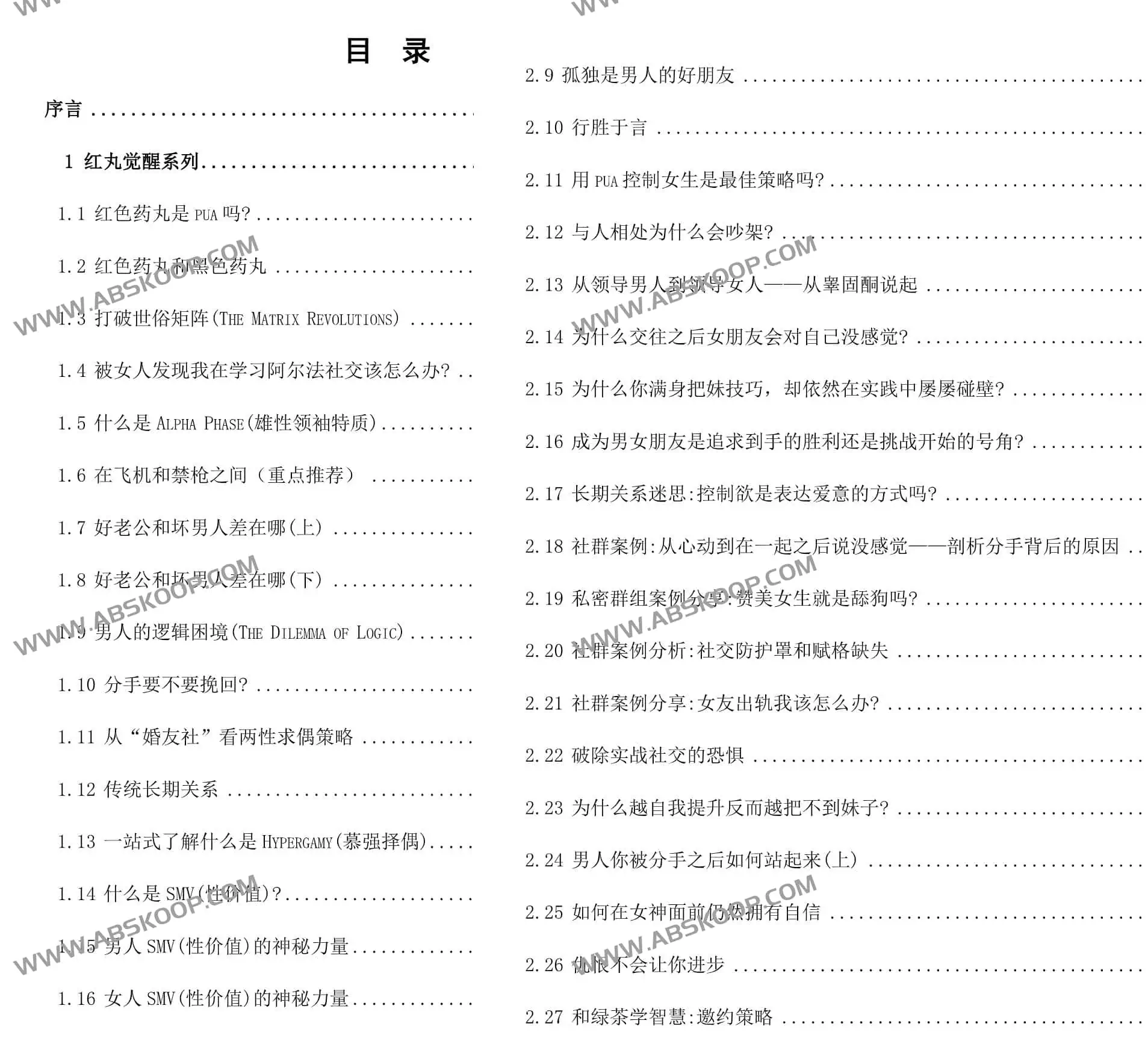 我很喜欢研究情感,喜欢站在理性的视角去分析所有社交行为背后的底层逻辑和技术原理。我在20 年年初第一次接触到了红色药丸,不可否认,这是每个男人必读的一本圣经。我希望能把国外最前沿、最原汁原味的一些理念在国内让更多人知晓,下面的这些文字,写给我自己,也写给所有渴望觉醒的男人女人。这本合集记录了我一年半左右的所有文章,主要包括红丸觉醒、社交技术、原点翻译以及驯猫之术四部分。要说明的是,这本合集的内容并非全部都是我原创,很多内容引用或翻译自国内外大佬的文案,所引内容也是经过我精心挑选,大家只管放心食用。其实严格来说,这并不是一本书,也谈不上什么武功秘籍,而更像是我在学习社交之路上的心得体悟。因为我知道独自探索之路有多难,所以我希望朋友们的觉醒之路不再孤独。仅此而已。