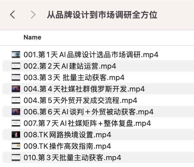 该内容围绕 “AI+ 外贸训练营” 展开,通过一系列视频课程,从品牌设计、市场调研、建站运营、主动与被动获客、社交媒体开发、谈判技巧到整体复盘,全方位指导如何利用 AI 技术优化外贸商务流程。同时,强调品牌包装、社交媒体账号打造、产品目录制作等细节,助力外贸企业高效运营。