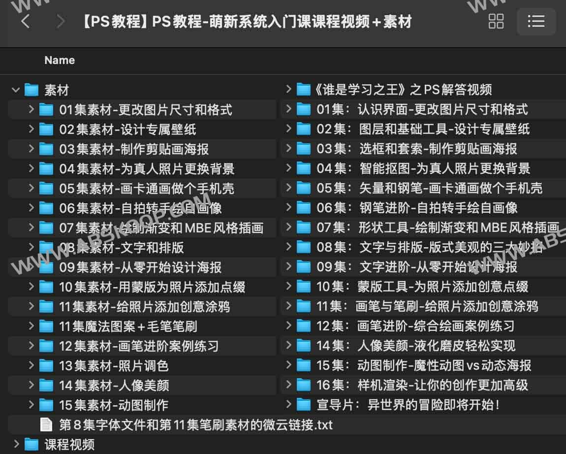 课程信息 【PS教程】PS教程-萌新系统入门课课程视频+素材,夸克网盘课程。 课程介绍 这套PS教程专为萌新打造,提供系统性的入门课程,涵盖图片尺寸调整、图层基础、剪贴画海报设计、照片换背景、卡通绘画、自拍转手绘、渐变插画、文字排版、海报设计、蒙版运用、创意涂鸦、人像美颜、动图制作等核心技能。课程结合实际案例,从基础工具到进阶技巧,帮助学习者快速掌握PS的关键操作,并附带素材文件,提升实操体验,让零基础用户也能轻松上手,创造高质量视觉作品。 课程大纲 课程下载 下载地址:夸克网盘 文章导航 大V美食色彩法,美食短视频,学习相机,清晰透亮灯光法,剪映剪辑,美感调色手机摄影达人速成