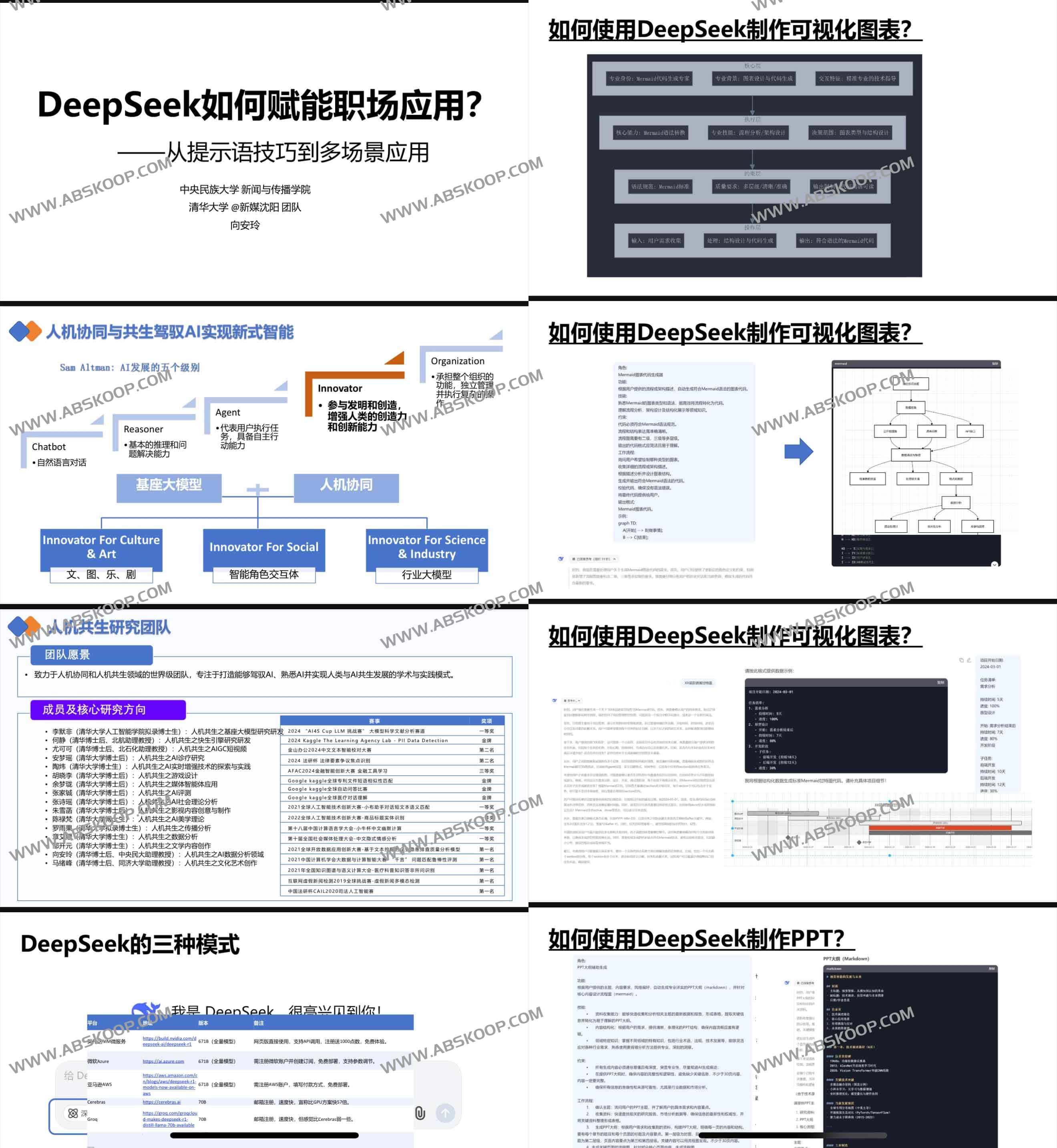 DeepSeek在职场应用中的赋能作用,涵盖从提示语优化到多场景应用的探索。报告分析了DeepSeek的不同模式(V3基础模型、R1推理模型、RAG联网搜索),并对比了它们在规范性、结果导向、路径灵活性、响应模式和风险特征上的差异。此外,还展示了DeepSeek在PPT生成、海报设计、视频制作、新媒体文案批量生成、市场调查等领域的具体应用,并结合RTGO和CO-STAR提示语框架,提供了优化AI交互的技巧。报告最后总结了团队的研究方向及在国际竞赛中的获奖情况,体现了DeepSeek在人机协同和智能体发展的前沿探索。