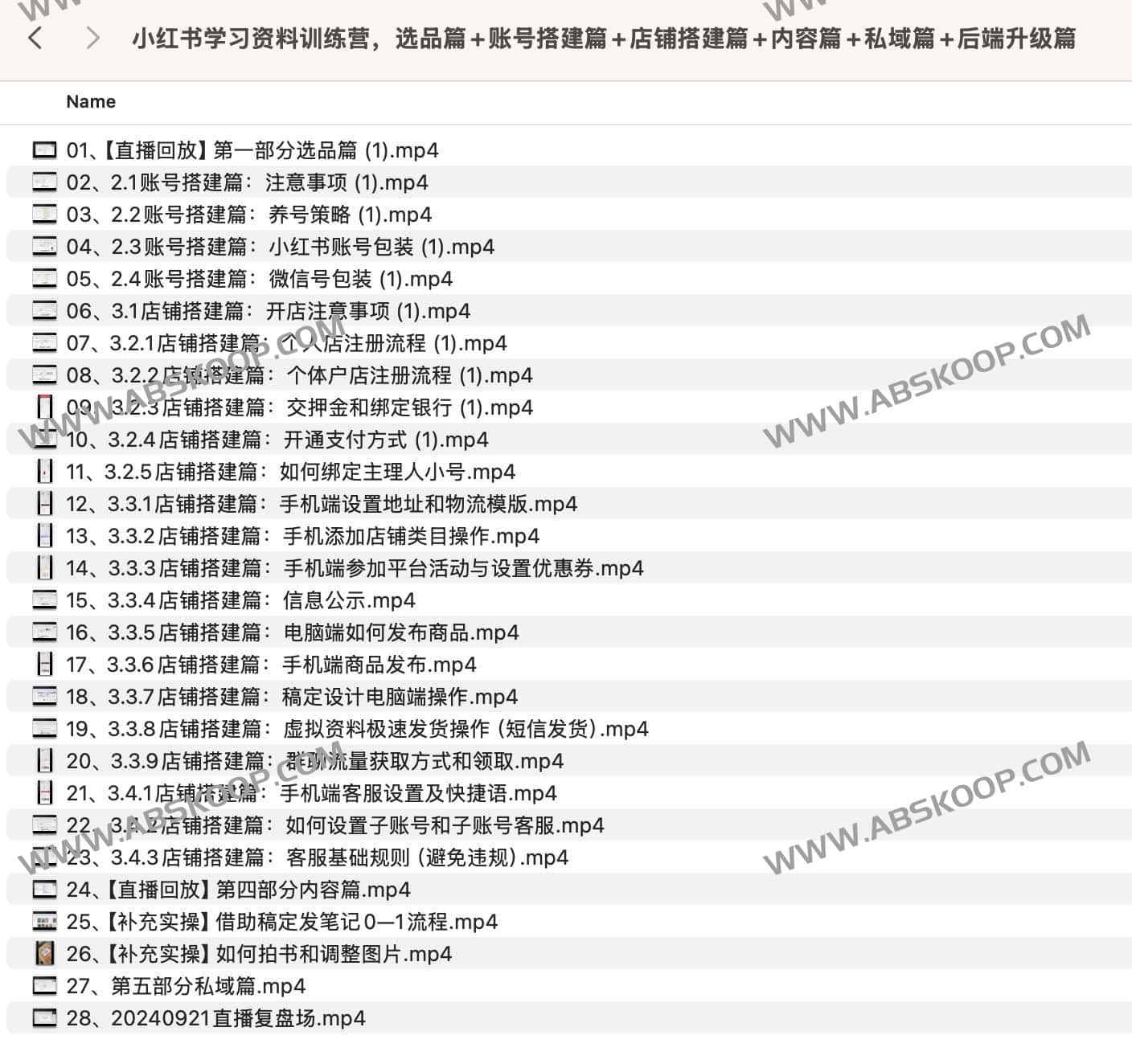 小红书学习资料训练营,选品篇+账号搭建篇+店铺搭建篇+内容篇+私域篇+后端升级篇,夸克网盘课程。