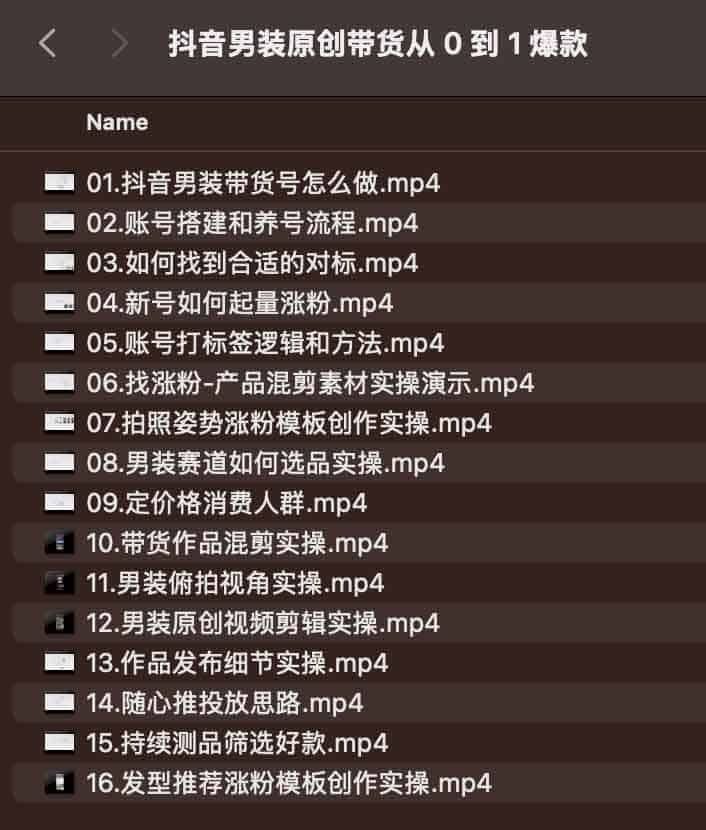 抖音男装原创带货从 0 到 1 爆款,夸克网盘课程。这套从零开始的抖音男装原创带货教程囊括账号搭建、内容创作、涨粉变现和投放优化等关键环节,共16节实操视频,帮助创作者迅速掌握打造爆款账号的秘诀。账号搭建与养号模块包括如何动手注册带货号、搭建人设以及养号流程,铺垫权重基础以获得平台推荐流量。对标分析部分讲解如何锁定竞品账号和胜出打法,确保内容发布方向准确。