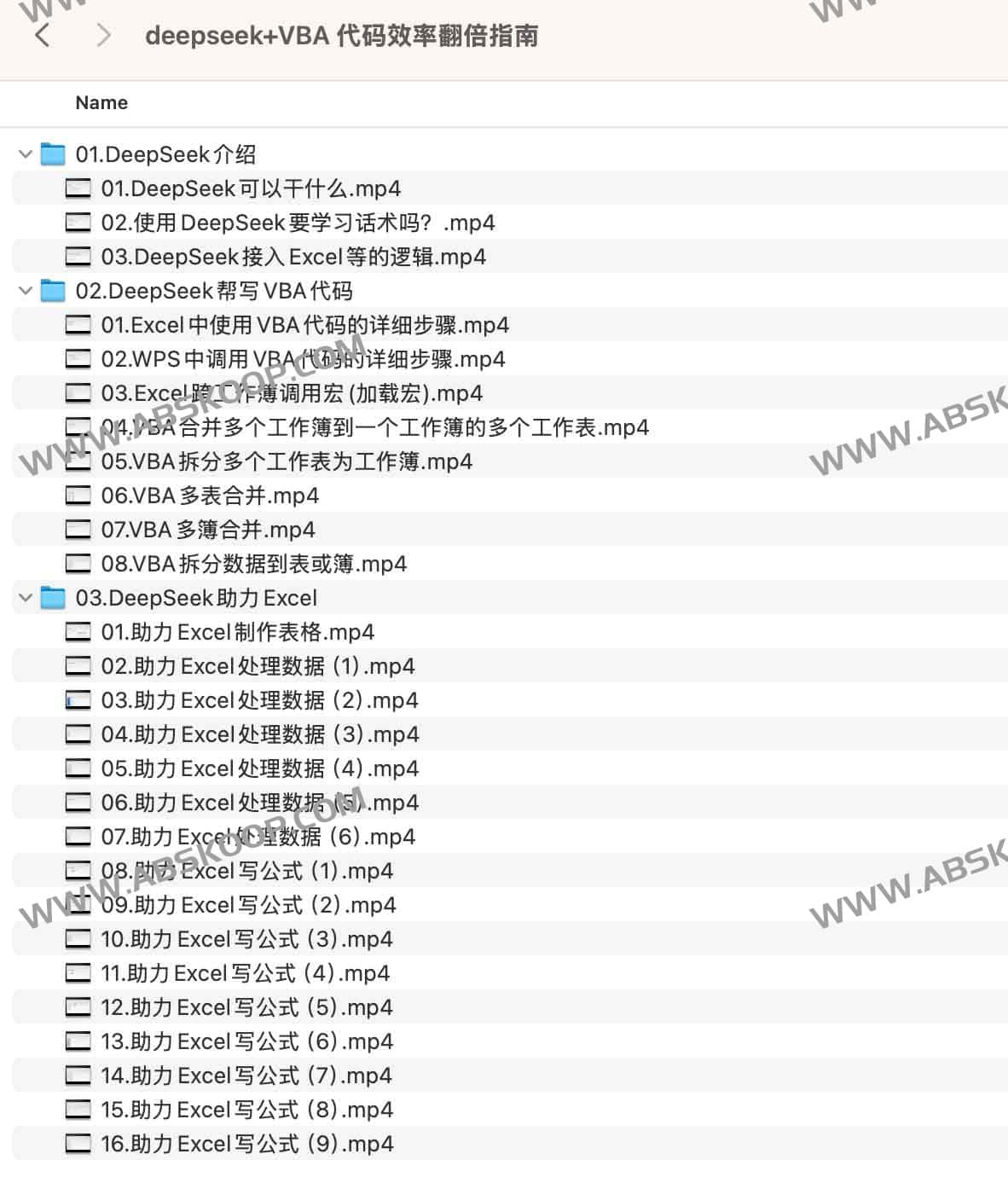 deepseek+VBA 代码效率翻倍指南,夸克网盘课程。课程以“DeepSeek+VBA代码效率翻倍指南”为核心,分为三个篇章,围绕DeepSeek的功能介绍、VBA代码生成与Excel自动化三大主题展开。无论是初学者还是有经验的办公人员,都能借助DeepSeek和VBA实现Excel工作流的质变升级,让繁琐重复的任务化繁为简,效率倍增。