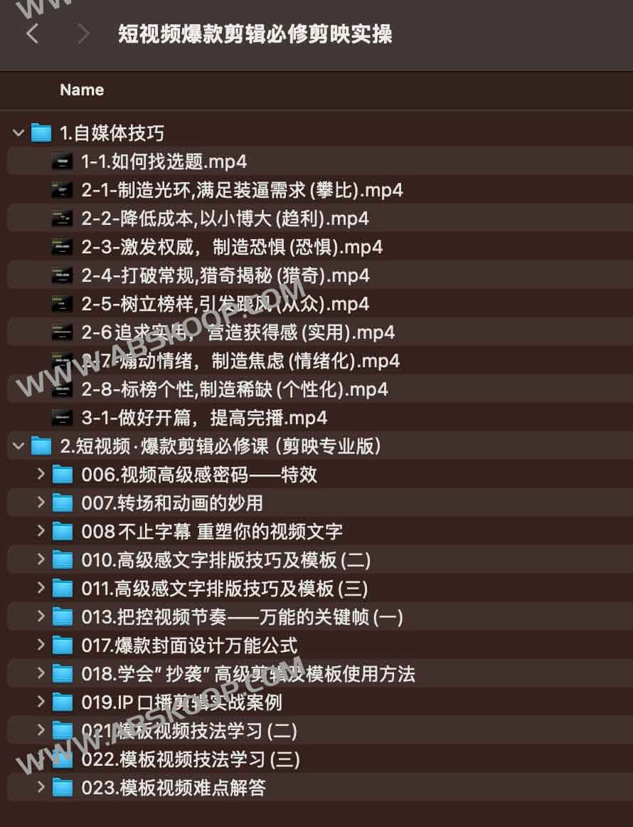 短视频爆款剪辑必修剪映实操,夸克网盘课程。这套短视频创作课程聚焦爆款内容制作与剪映专业版实操,分为自媒体内容策划与专业剪辑技术两大模块。内容创作部分深度解析8大人性法则:通过制造身份光环满足用户社交需求,利用超低成本策略放大获得感,运用权威效应引发心理认同,结合猎奇元素打破常规认知,借势从众心理打造现象级传播,精准触发实用价值与情绪焦虑,最终实现稀缺性内容塑造。