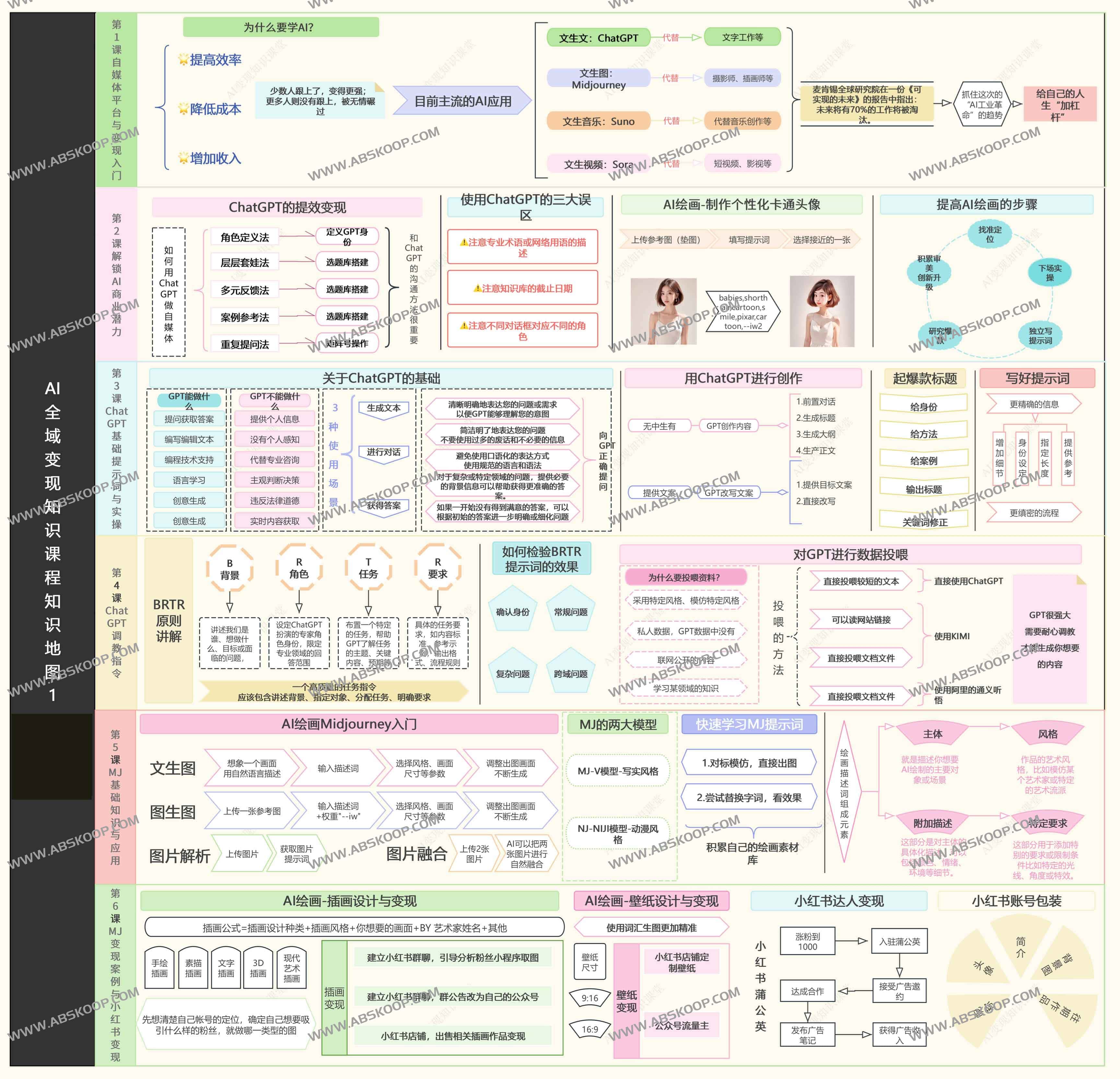教学体系贯穿”工具掌握-内容创作-商业闭环”三层逻辑,既包含AI绘画与音乐生成的技术解析,也涉及电商营销、表情包经济等变现路径。最终通过知识地图整合,帮助学员构建从IP经营到流量转化的完整商业思维。