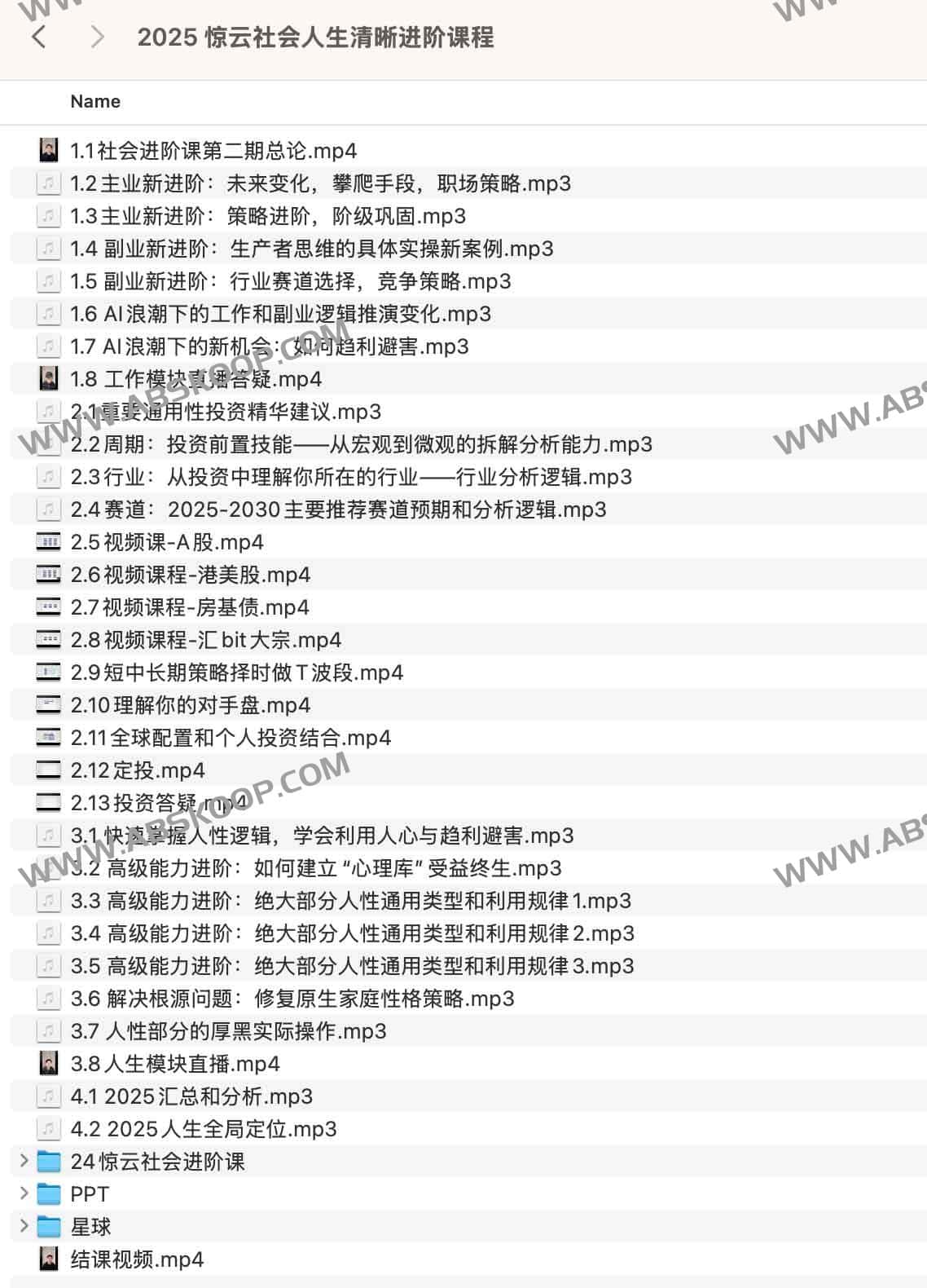 2025 惊云社会人生清晰进阶课程,夸克网盘课程。这套课程体系围绕个人发展四大核心维度展开,覆盖职场跃迁、财富布局与人性洞察领域。第一部分聚焦主业与副业双线突破:拆解未来职业环境演变规律,提供阶级跃升的实战方法论,同步输出生产者思维在自媒体、知识付费等领域的应用案例,结合AI技术重构副业逻辑,揭示如何规避风险并捕捉新兴机遇。