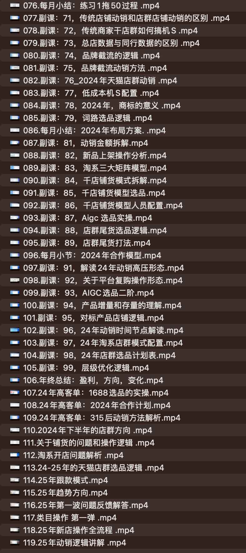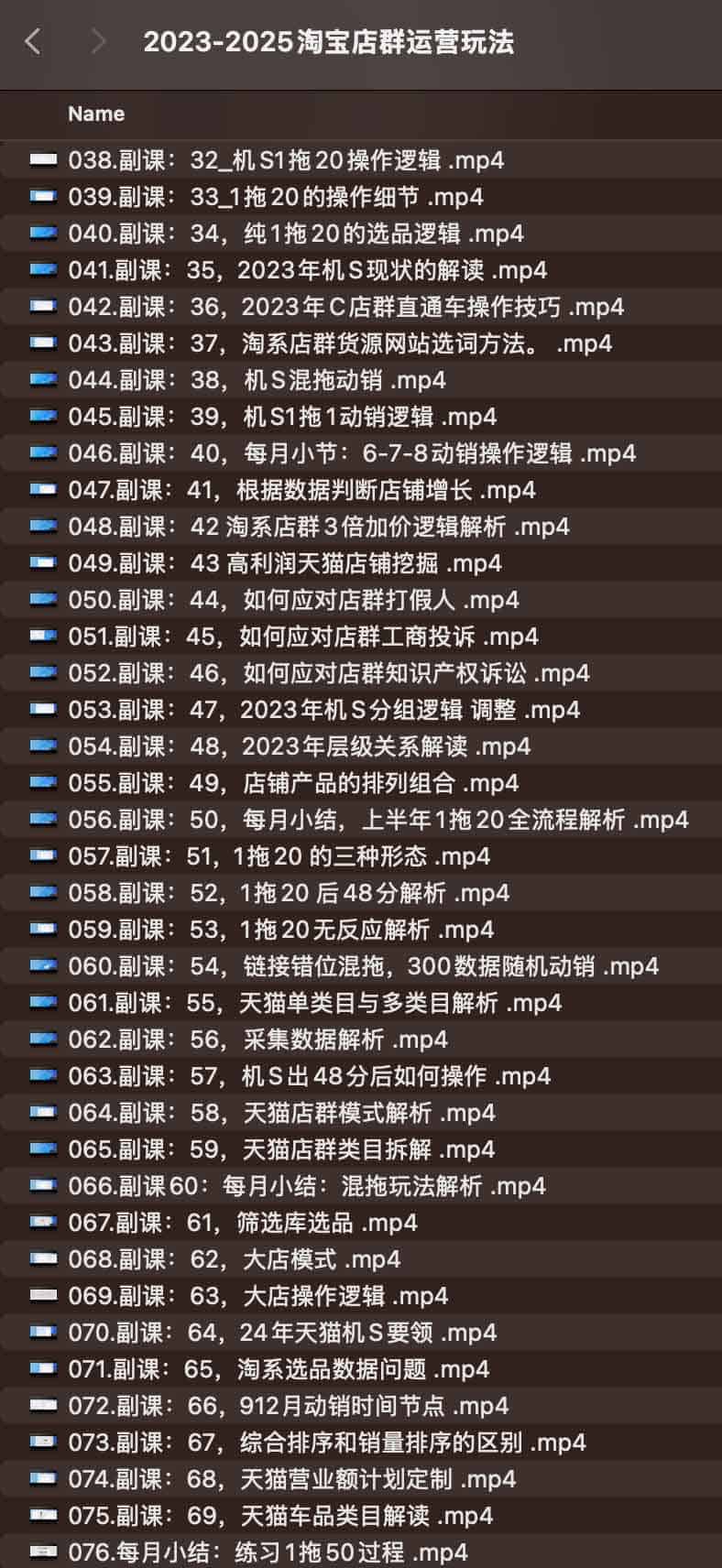 2023-2025淘宝店群运营玩法,夸克网盘课程。这套课程覆盖2023至2025年,系统拆解淘系店群高客单玩法。课程从批量选品逻辑与机S配置切入,结合直通车与插件工具,教授如何快速筛选并验证爆款。深入剖析店铺优化赛马模型以及多种拖动销策略,帮助你通过数据判断增长、调整分组与层级关系,掌握动销节奏。