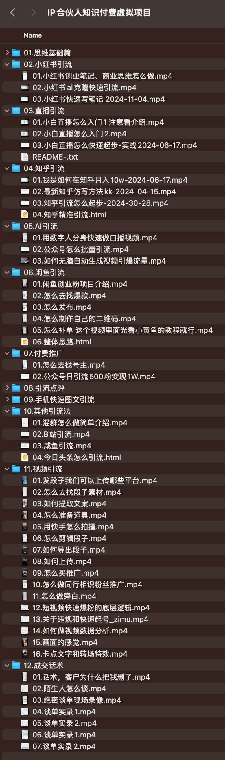 IP合伙人知识付费虚拟项目,夸克网盘课程。这套课程为知识付费创业者打造了完整的引流变现体系。从商业思维筑基开始,逐步拆解小红书平台运营技巧:创业笔记撰写、AI克隆引流技术、高效笔记创作方法一应俱全。直播模块聚焦新手入门,涵盖设备准备、话术设计到实战起号全流程。
