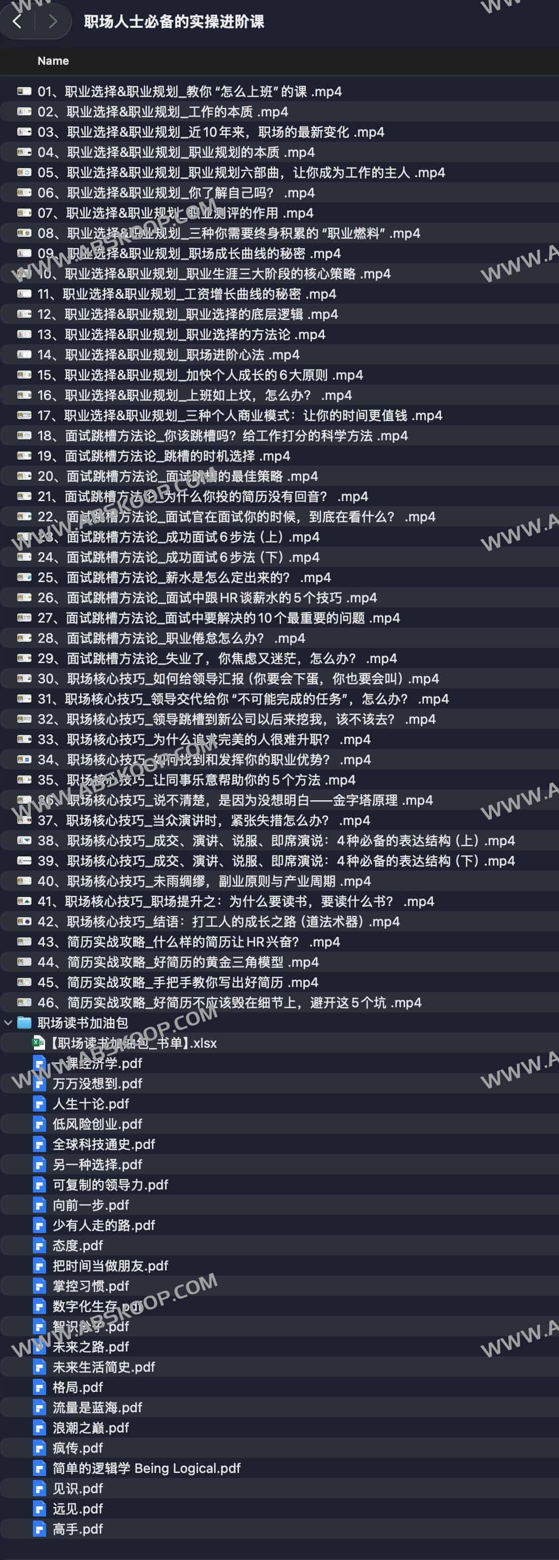 职场人士必备的实操进阶课,本套「职场人士必备的实操进阶课」由高清视频和精选书单组成,覆盖职业规划、面试跳槽、核心职场技能与简历打造四大模块,帮助学员系统掌握应对挑战的方法,提升工作效率与职业竞争力。