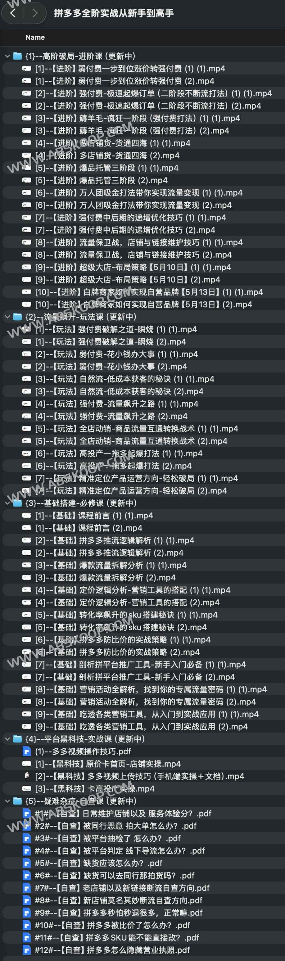 拼多多全阶实战从新手到高手课程,系列课程按“基础→进阶→玩法→黑科技→自查”递进,覆盖新手建店、流量引爆、付费效率提升与疑难排障,帮助商家快速布局、稳健放量、长效盈利。