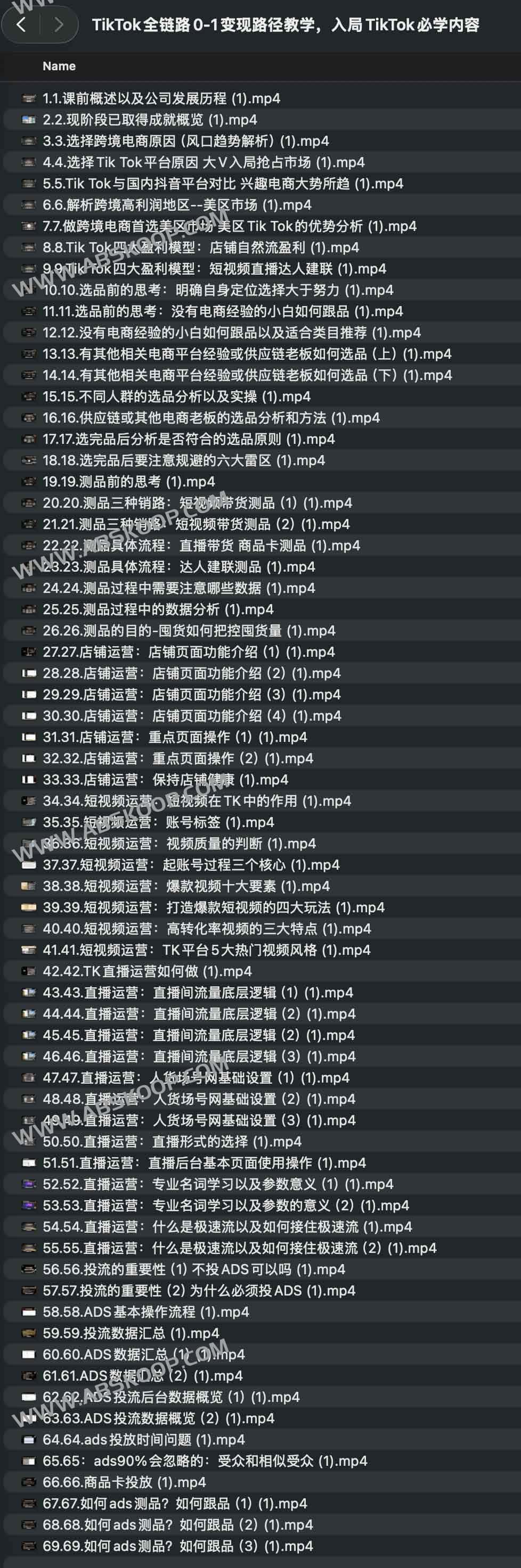 TikTok全链路0-1变现路径教学,入局TikTok必学内容,这套课程系统梳理了TikTok跨境电商从0到1的完整变现路径,涵盖平台趋势解析、选品策略、店铺搭建、内容运营、直播带货、达人合作、投流技巧等模块,帮助不同背景的创业者快速入局并实现可持续盈利。