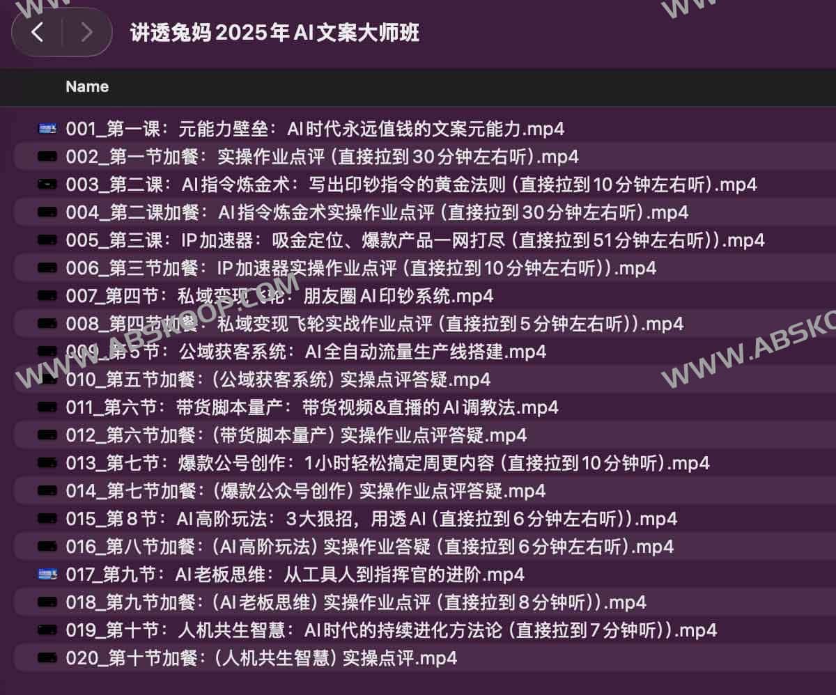 兔妈2025年AI文案大师班系统涵盖10大核心模块,从文案思维到商业变现全链路教学,帮助学员在AI时代掌握高价值的文案与营销能力。课程不仅教授理论,还配备实战作业与点评,确保学员能够快速落地应用。