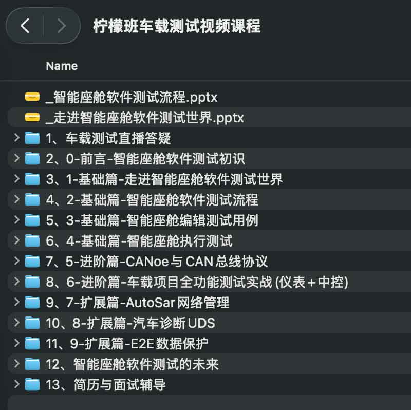 柠檬班车载测试视频课程,围绕智能座舱的软件测试体系展开,覆盖基础认知、流程方法、用例编辑、功能执行、总线与诊断、项目实战到职业发展。包含台架/实车/路测实践与蓝牙、导航、语音、AVM、多媒体、车辆/系统设置等高频功能测试场景,并延伸至 AUTOSAR 网络管理、UDS 诊断、E2E 数据保护。课程新增“车载测试视频拍摄”专项,讲解设备选择、镜头设计、拍摄技巧与剪辑流程,帮助学员输出可复用的测试演示素材。