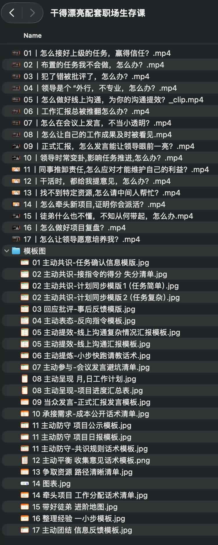 干得漂亮配套职场生存课是一套专为职场新人和职业人士设计的高效沟通与应对策略培训,帮助学员在不同工作场景中快速反应、精准表达,并赢得上级和同事的认可。课程通过真实案例与实用模板,覆盖从接任务、沟通反馈、会议发言到项目推进等17个高频职场场景,让你在复杂的人际与业务环境中游刃有余。