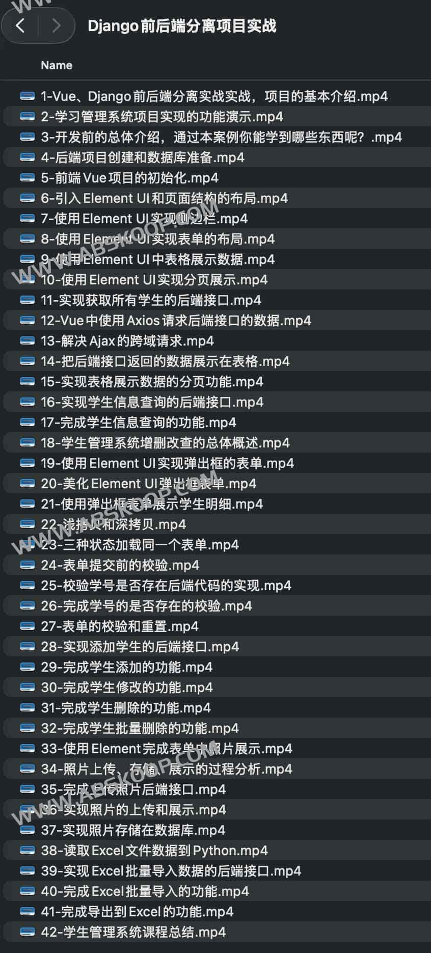 Django前后端分离项目实战,这套课程通过实战开发一个学生信息管理系统,完整展示了 Django(后端)与 Vue.js(前端)前后端分离的开发流程。项目采用 Django REST framework 构建后端接口,前端使用 Vue 配合 Element UI 搭建交互界面,结合 Axios 进行数据通信,涵盖用户管理、表单操作、数据展示、图片上传、Excel导入导出等关键功能。