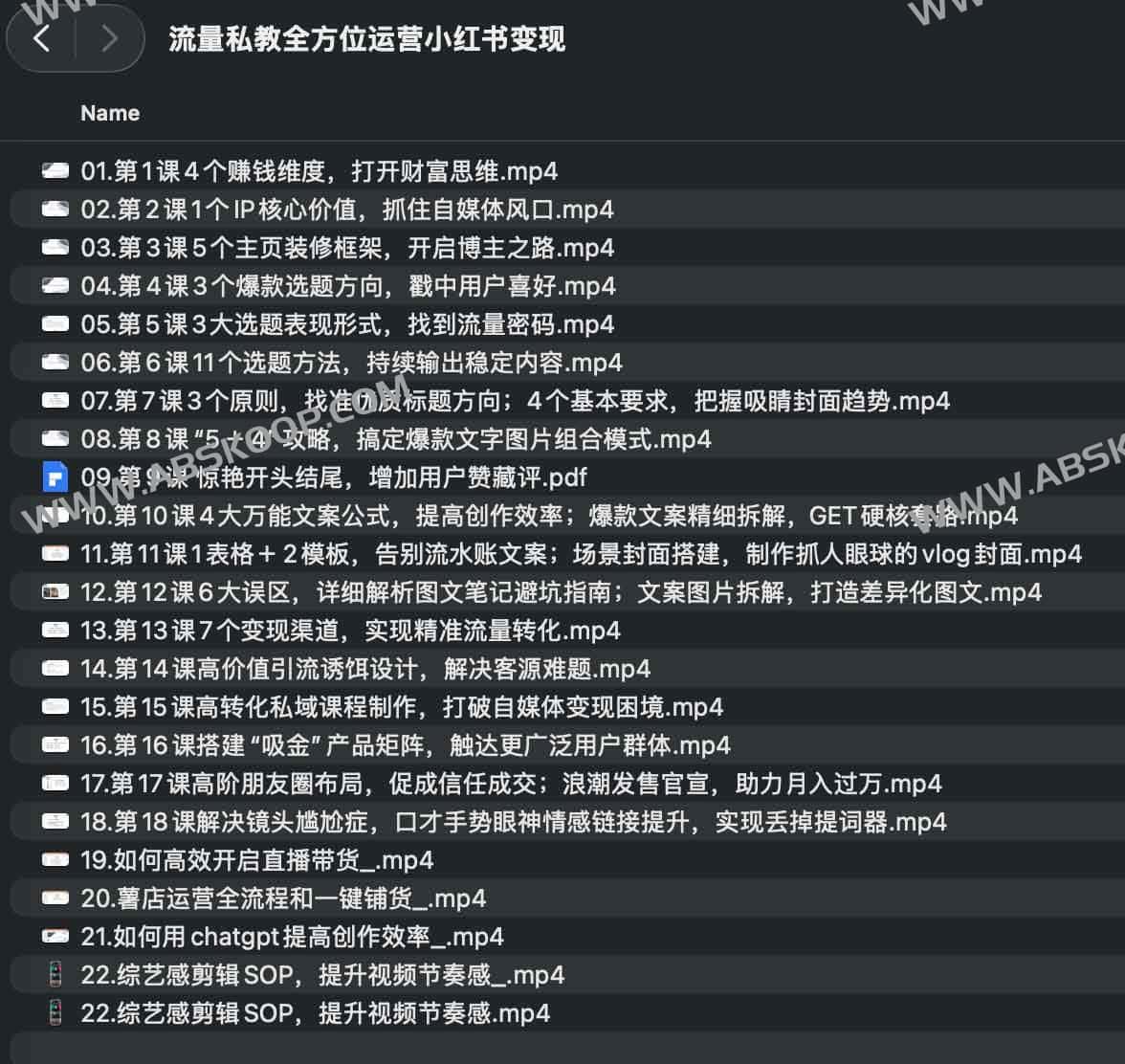 流量私教全方位运营小红书变现,这套内容围绕“小红书/自媒体”从认知到落地的完整路径展开,覆盖财富思维、个人IP定位、主页搭建、选题方法、标题与封面策略、文案与图文结构、避坑要点、变现通道与引流设计、私域课程与产品矩阵、朋友圈成交布局,以及镜头表达与剪辑节奏。配套直播带货与薯店运营流程,并提供AI工具(ChatGPT)提效思路与综艺感剪辑标准作业流程(SOP)。