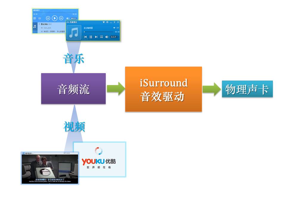 iSurround软件将Windows上各种应用程序送到声卡进行播放的声音信号截获并进行特殊的音效增强处理后再送给物理声卡进行输出。下图显示了其在电脑中的位置和工作方式。简而言之,如果您的电脑没有安装iSurround音效增强软件,当您通过百度音乐、酷狗音乐、QQ音乐、优酷播放器或暴风影音播放器来播放音视频文件时,这些播放器会将您的音视频文件解码后直接送给声卡输出;但是当您安装iSurround音效增强软件后,iSurround会在这些声音信号进入到物理声卡前将其截获,利用先进的数字信号处理技术和心理声学原理将这些声信号添加上各种效果,然后iSurround再把这些带有特殊效果的声信号送给物理声卡。