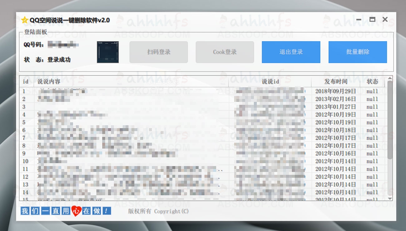 说说是QQ空间推出的一个心情分享功能,很多Q友都喜欢用说说记录自己的生活点滴,当不想自己的隐私被别人知+道时,大家普遍都会删除说说,不过一条一条的去删除,实在太过麻烦。QQ空间说说一键批量删除软件是专门针对qq空间说说开发的批量删除软件,只需要登陆你的QQ账号,就可以一键删除空间说说,方便好用,为您节省了大量的时间。
