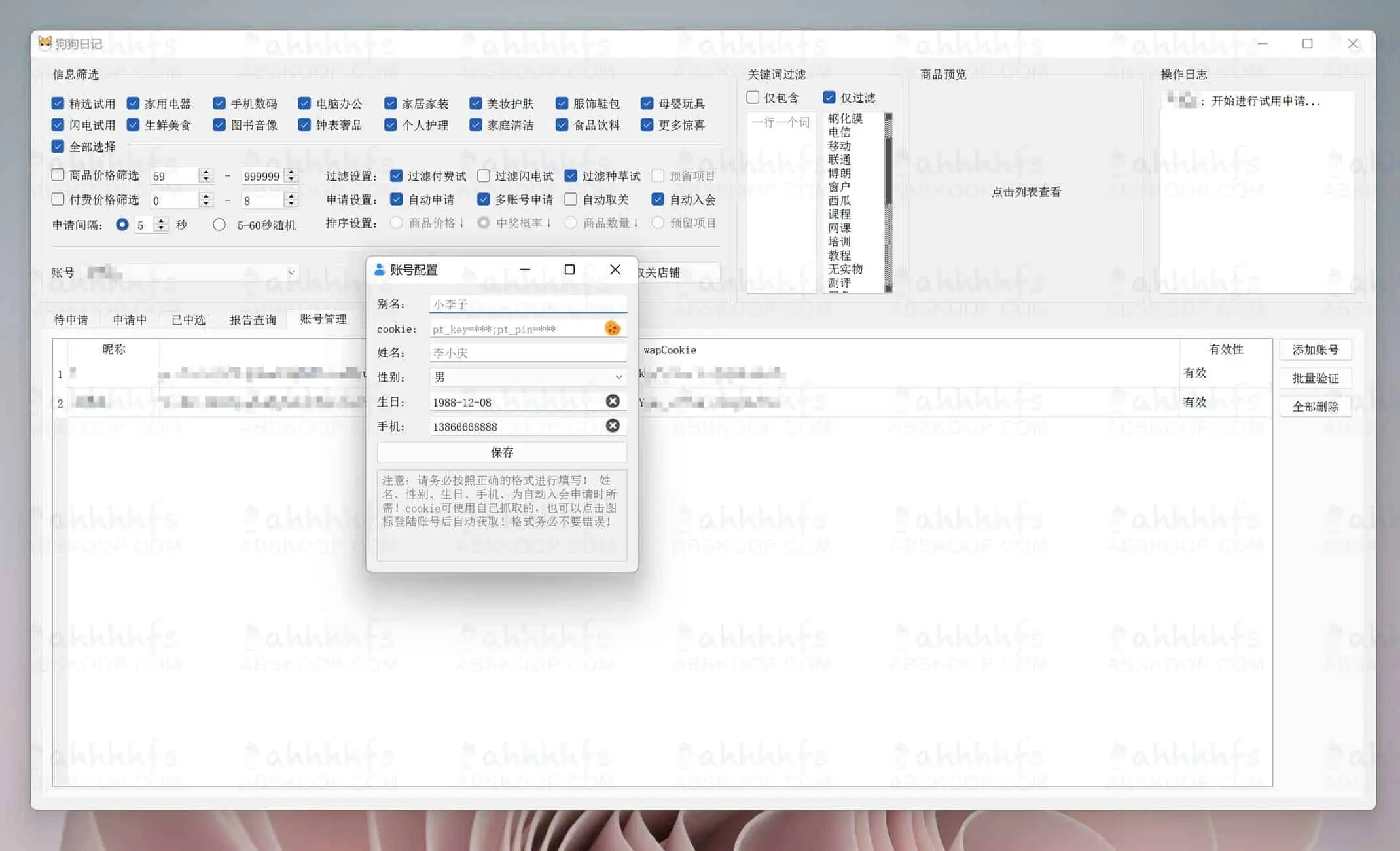 京东试用入口在哪里呢,很多人找不到,这款软件基本上继承了鲸猫的京东试用功能,额外添加了自动入会(部分商品需要加入店铺会员,需要手机号、生日、姓名、性别等支持,好像可以随意填个假的。部分黑号可能无法加入会员),如果担心可以用小号测试哈。
